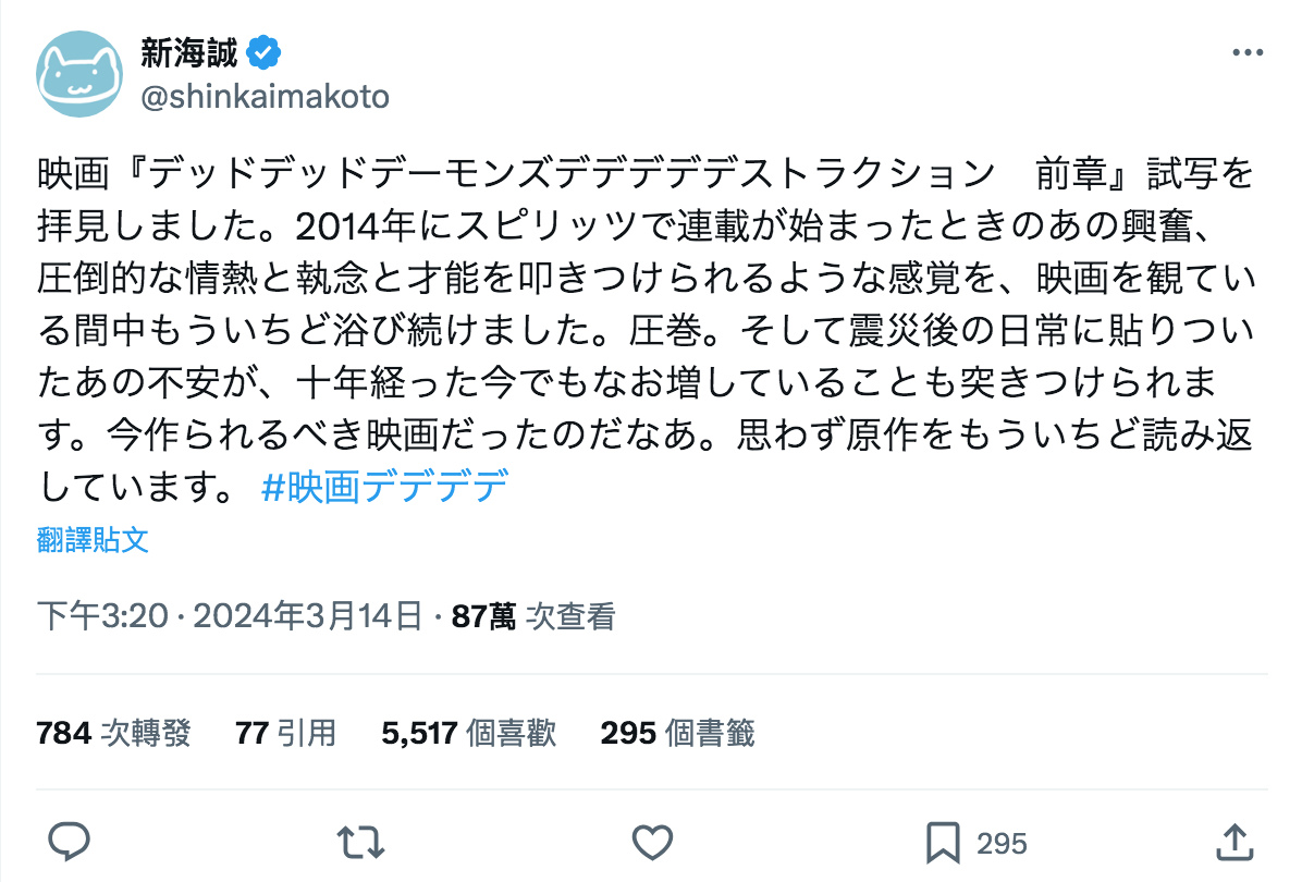 日本動畫電影《DEAD DEAD DEMONS DEDEDEDE DESTRUCTION 惡魔的破壞》改編自人氣漫畫家淺野一二O的同名作品,日本官方宣布劇場版將分二部推出。動畫大師新海誠近日參加《惡魔的破壞 前章》試映會,內心深受震撼。而《惡魔的破壞》前章及後章,台灣將由台北双喜電影「海外首發」,影迷們不用等太久,不久後將搶先全亞洲看到這部大師欽點激讚的佳作!