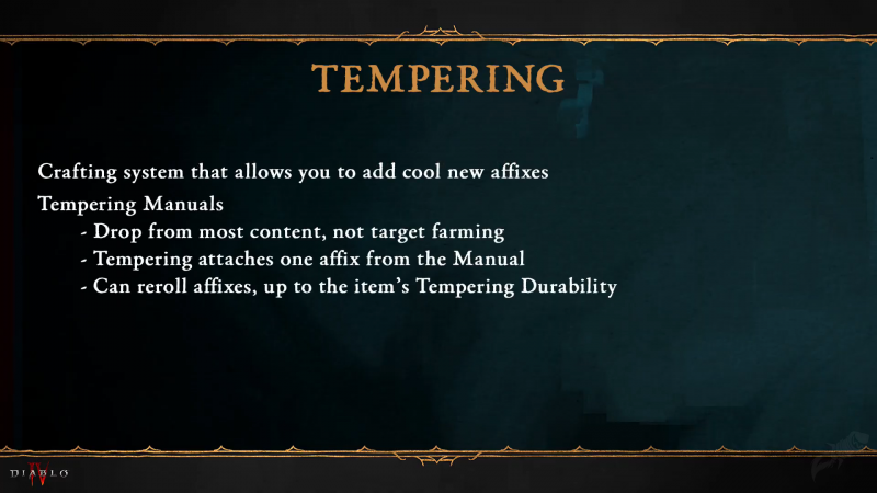 鍛造(Tempering)是全新的打造系統,可以讓玩家為裝備附上新詞綴,必須使用新材料配方(Manuals),配方無特定掉落,全遊戲內容都有機會獲得。每個配方有 4 種詞綴,透過鍛造可以隨機將其中一種詞綴附到裝備上。高階裝備可以透過該系統額外獲得兩條詞綴。