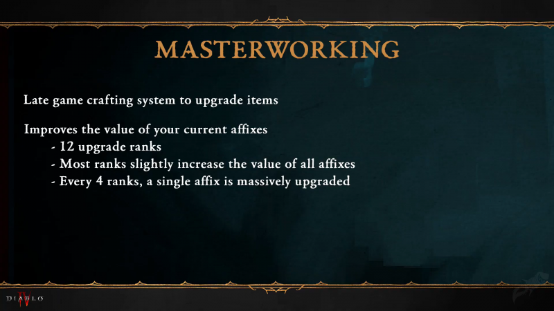 精工(Masterworking)則是另一項新打造系統,並取代掉以往的五星強化。裝備可進行最多 12 次精工,每次精工都會些微強化該裝備上全部詞綴數值效果,達到 4、8、12 時則會隨機大幅強化其中一項詞綴,並且可作用在同一條詞綴上。