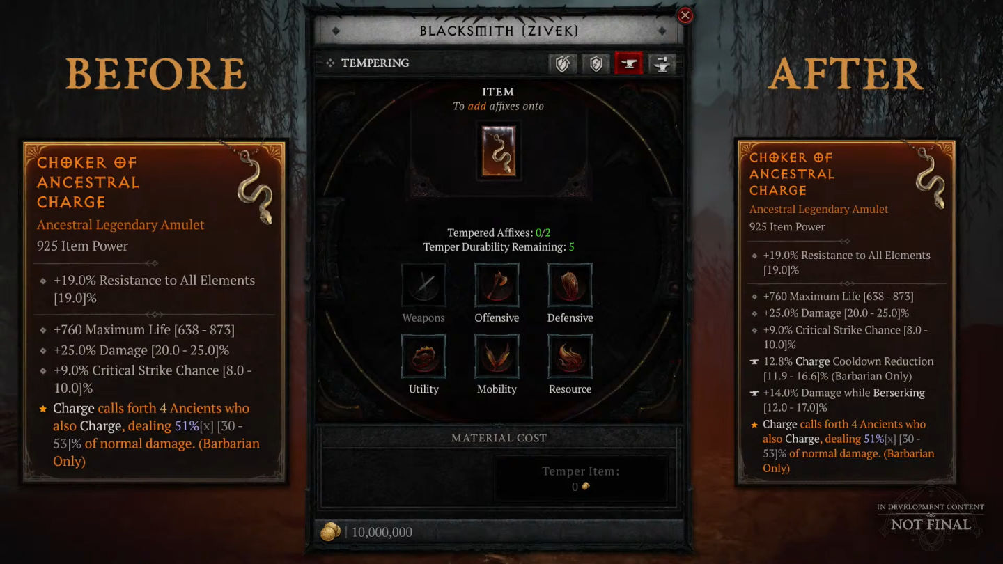 過往傳奇裝的 5 條詞綴下調為 3 條,但效果能力更加強大,一些無用的詞綴也將移除,傳奇裝與獨特裝備可交易。改動用意為讓玩家能更直覺判斷裝備是否合用,以及讓玩家後續打造成心目中理想裝備。