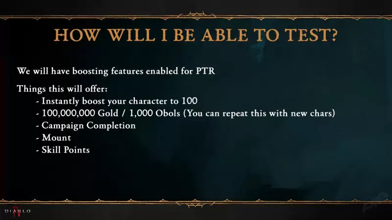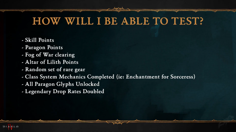 玩家在 PTR 中等級為 100,並擁有大量金幣等消耗道具,設定為主線全破並擁有坐騎及技能點,傳奇掉率加倍等等,讓玩家能專心迅速測試新功能部份,詳細項目將於下周公開。