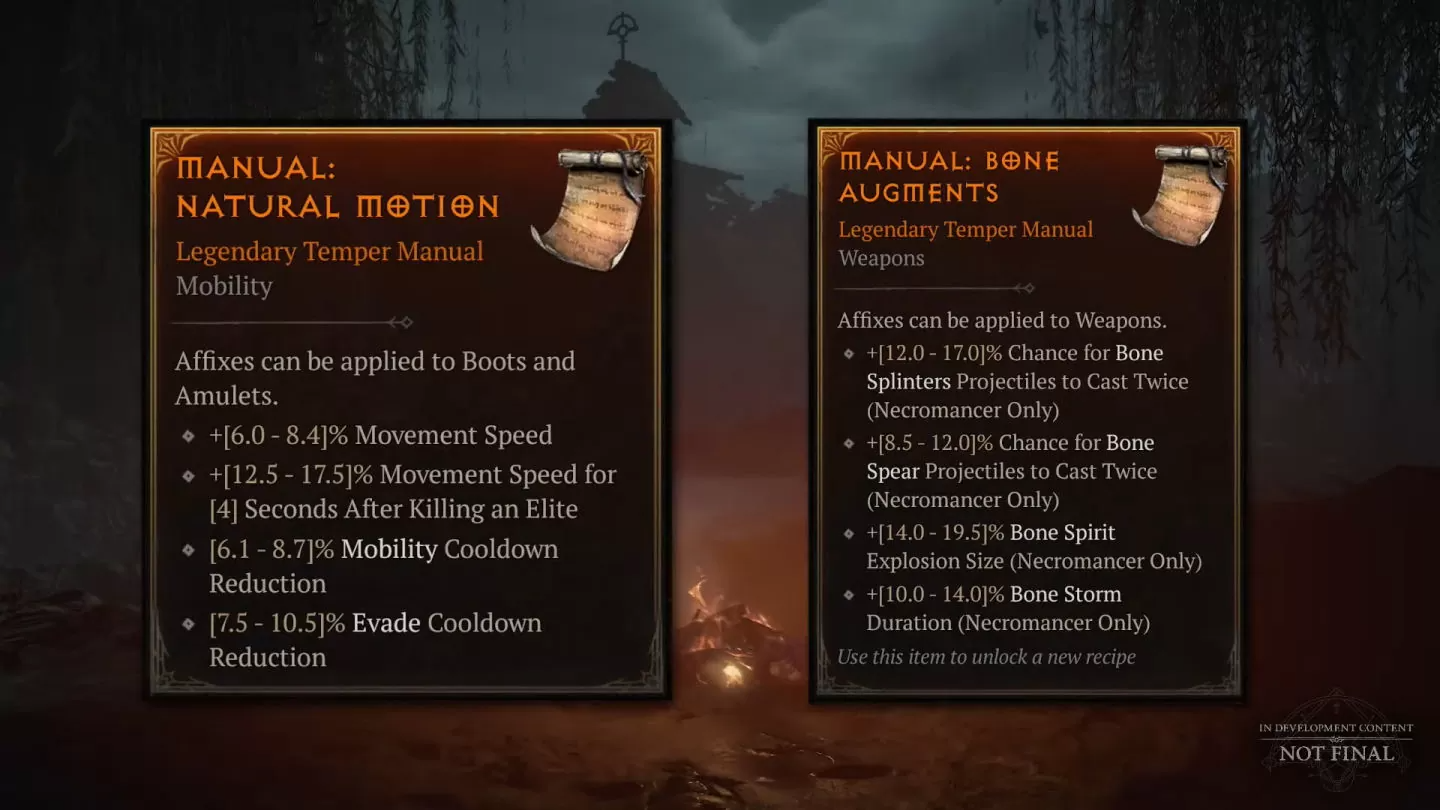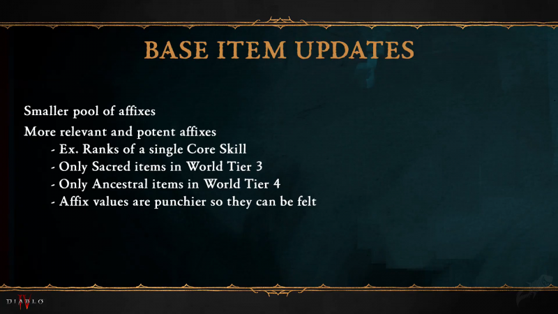 細節將會於日後公開,本次直播中釋出範例包括魔法使的技能標籤更新:精通技能也具備核心技能標籤。冰封球改為飛向指定位置而非固定直線,死靈法師與德魯伊的隨從將 100% 繼承玩家能力等等。獨特裝備也有更多連鎖效果,例如示範影片中玩家能以冰封球召出火蛇,而火蛇又有機會噴出冰封球,成為連鎖效果。