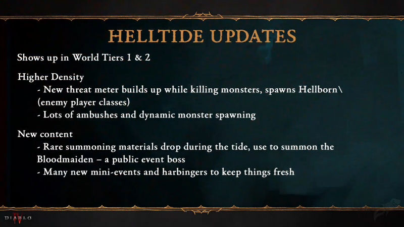 在世界 1 & 2 也開始會有地獄浪潮,並且會新增一個威脅量表,類似於先前血宴,當玩家殺怪殺到量表集滿後,就會引發大量敵人包括精英怪來襲,對農裝、道具、經驗相當有幫助。