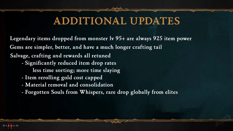 隨著《最後紀元》大受歡迎,以及《流亡黯道2》即將推出,或許暴雪娛樂也感受到競品壓力。依據最先前副總監 Joe 所述與大秘境回歸等,可以看出《暗黑破壞神4》在歷經了 3 季調整,後續路線方向不再往「角色扮演」部份靠攏,而更偏向《暗黑破壞神3》的砍殺打寶。在直播中官方也表示本次只公開約一半的資訊,還有更多資訊會於之後陸續釋出。