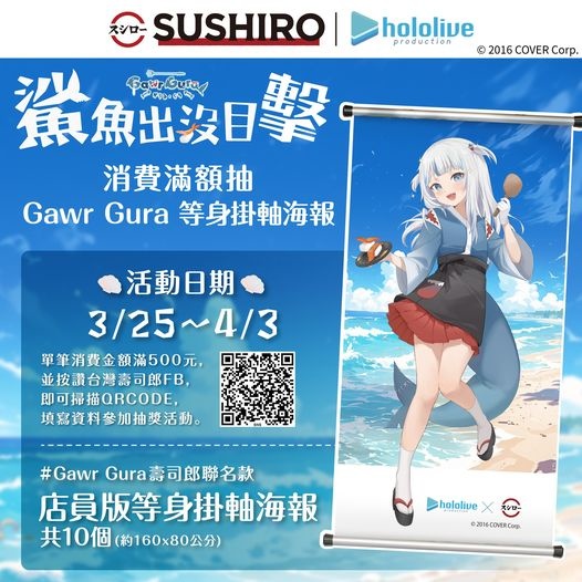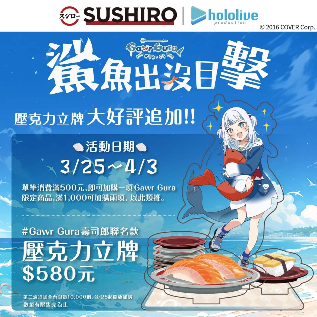 現正於 hololive 人氣 Vtuber「Gawr Gura」舉辦聯名活動的台灣壽司郎宣布,廣受蝦民們好評的超可愛 Gawr Gura 壓克力立牌追加登場,自 3 月 25 日至 4 月 3 日限期開放加購,並加碼等身掛軸海報抽獎活動。