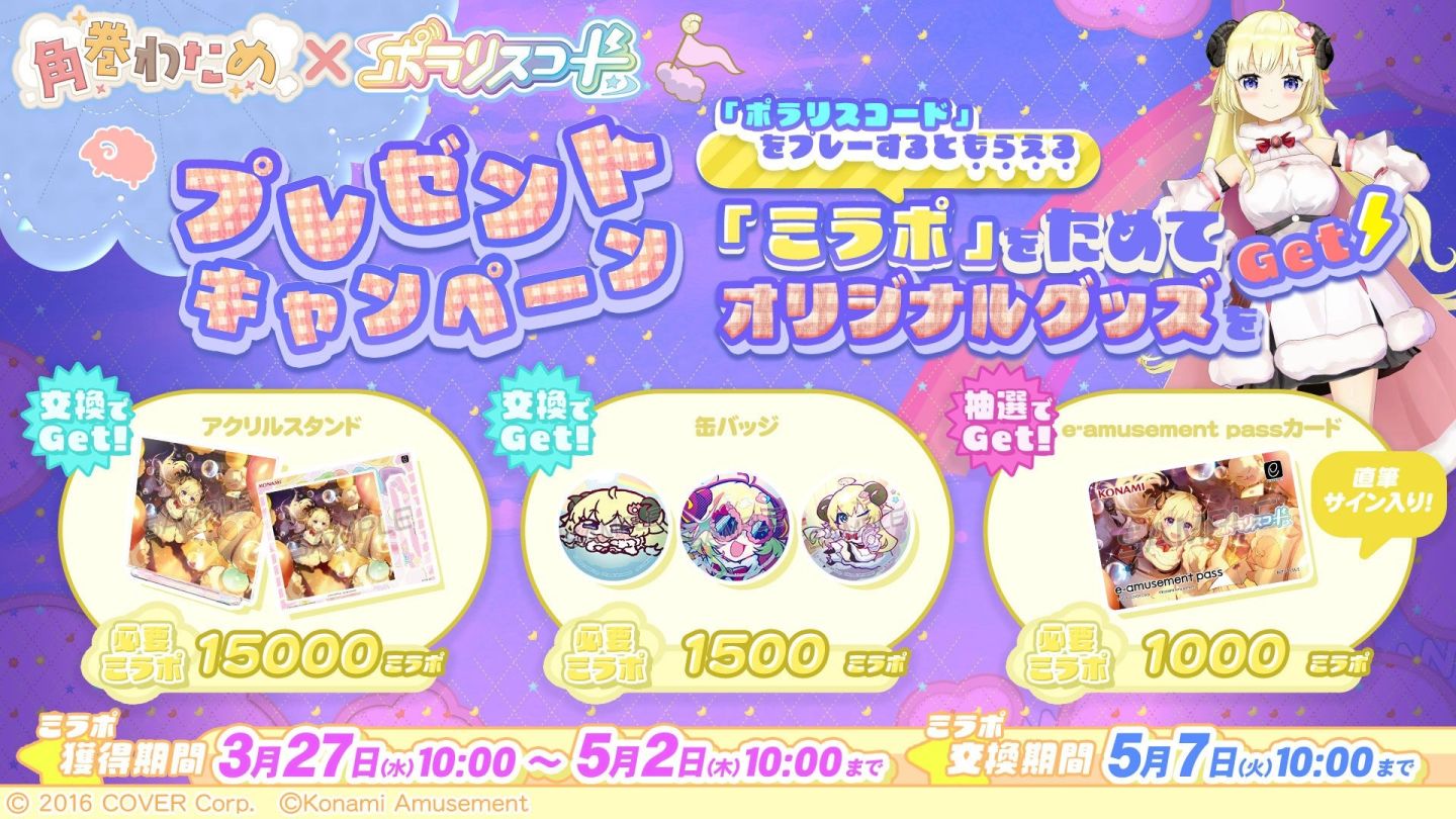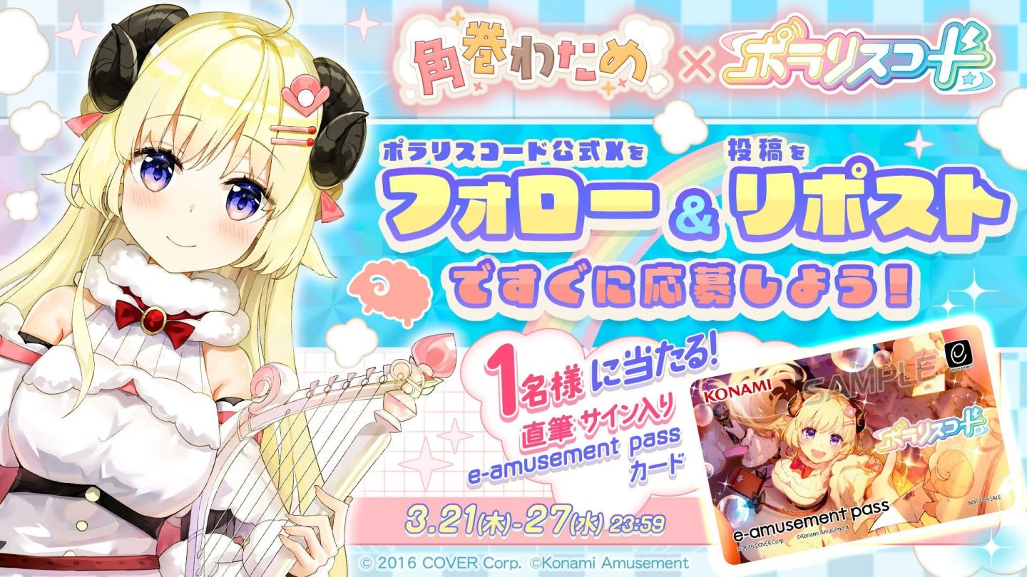 日本 KONAMI 旗下全新街機音樂遊戲《PolarisChord》(ポラリスコード)於今(27)起依序在日本國內遊樂設施營運,同步舉辦與 hololive 人氣 Vtuber「角卷綿芽」(角巻わため)的合作活動。