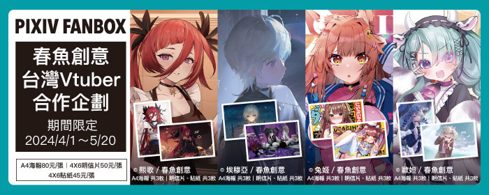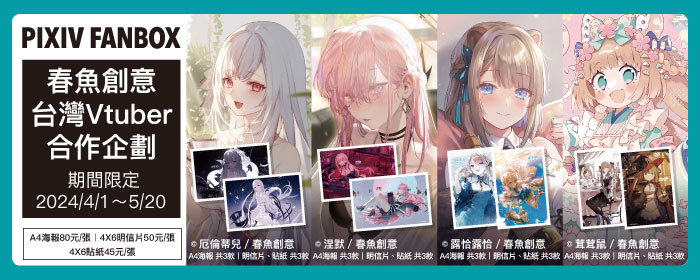 台灣 VTuber 公司春魚創意與 pixivFANBOX × ibon 首次合作,推出期間限定「春魚創意 台灣 VTuber 合作企劃」,將呈現以春魚創意旗下 VTuber 露恰露恰、歐妲、厄倫蒂兒、涅默、埃穆亞、熙歌,以及合作 VTuber 茸茸鼠和兔姬共8位超人氣虛擬偶像為主題的精美插畫24款。自4月1日起至5月20日止,只要到 7-ELEVEN 的 ibon 機台列印,就能輕鬆把喜歡的推帶回家!