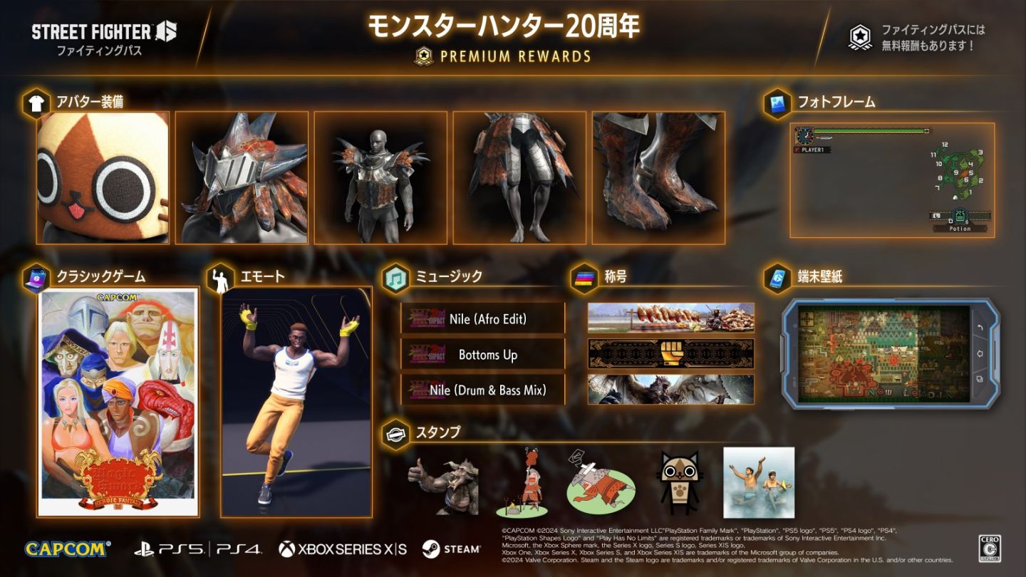 其他 Premium 報酬還包括有「一起去狩獵吧!」的相機邊框和「燒烤達人」等的稱號,以及代表《Monster Hunter》系列的「獵人之舞」表情動作,所以當你想著「這個人是獵人嗎?」的時侯,就試著試著揮手致意吧。