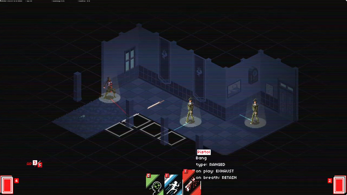 遊戲裡當敵人注意到玩家或是他們的目標時,就會出現一條提示用火線,可以此為參考決定下一步的行動,像是離開火線就能閃避子彈,並進行一擊必殺的反擊,要注意的是只要被敵人擊中一次遊戲就會結束,若玩家的 AP 值還足夠就能使用卡片,但必須當場停下來更新手牌或補充 AP 值,因此時機的掌握非常重要。