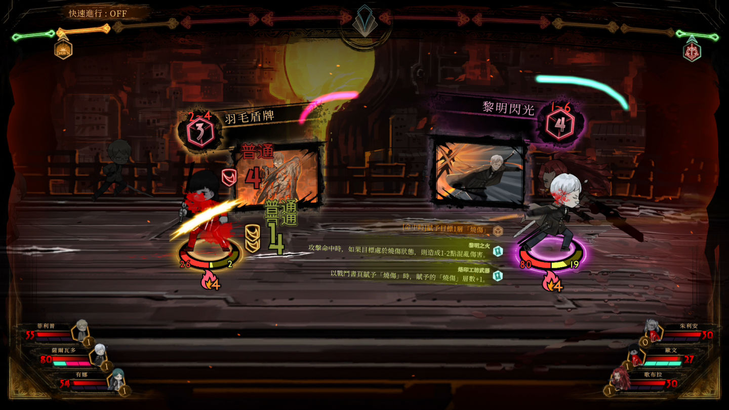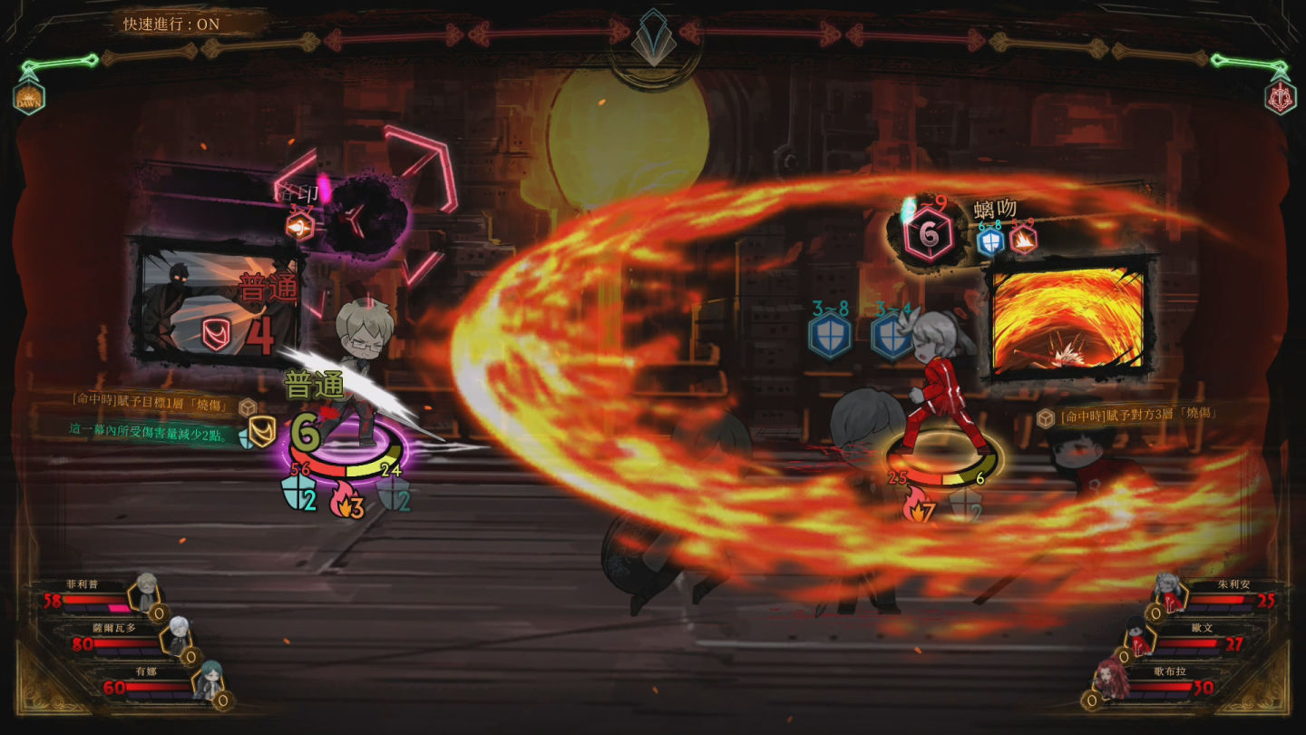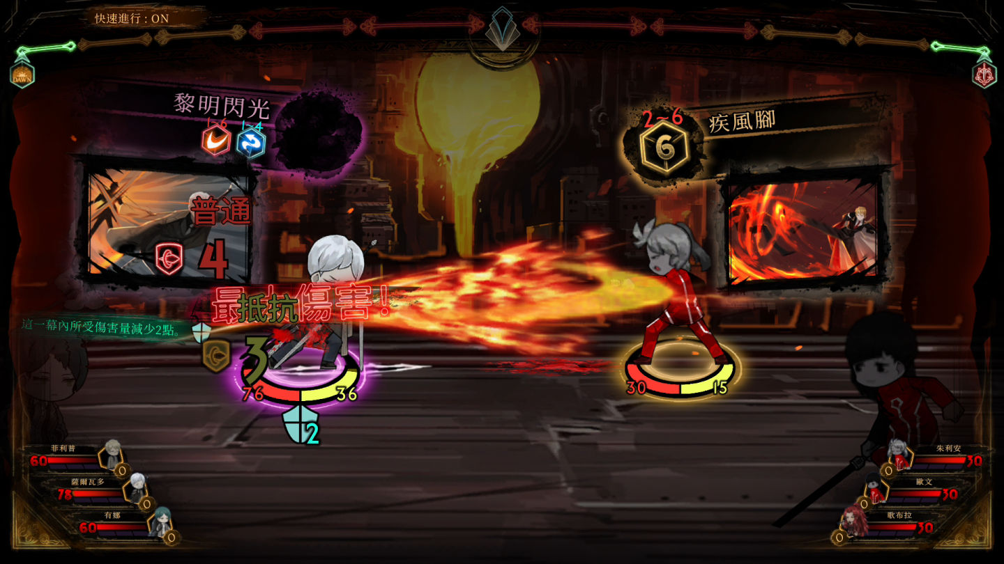 戰鬥中將互相擲骰子並按照數字大的順序行動。當彼此成為攻擊對象時,「合」將成立,這時再次擲骰子,數字大的一方在合中獲勝並將造成對方傷害。
