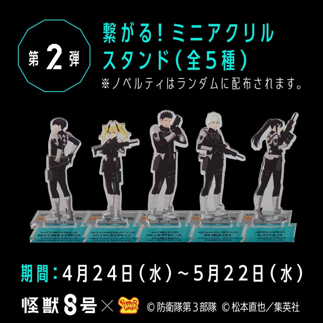 秋葉原中央通店的門口裝飾成被怪獸襲擊過的樣子,以此和《怪獸 8 號》世界觀連結,店內也布置防衛隊第三部隊的成員海報,包括日比也卡夫卡、市川雷諾、四之宮琪歌露、保科宗四郎、亞白米娜五位角色,粉絲可在他們的看顧下安心吃飯 XD