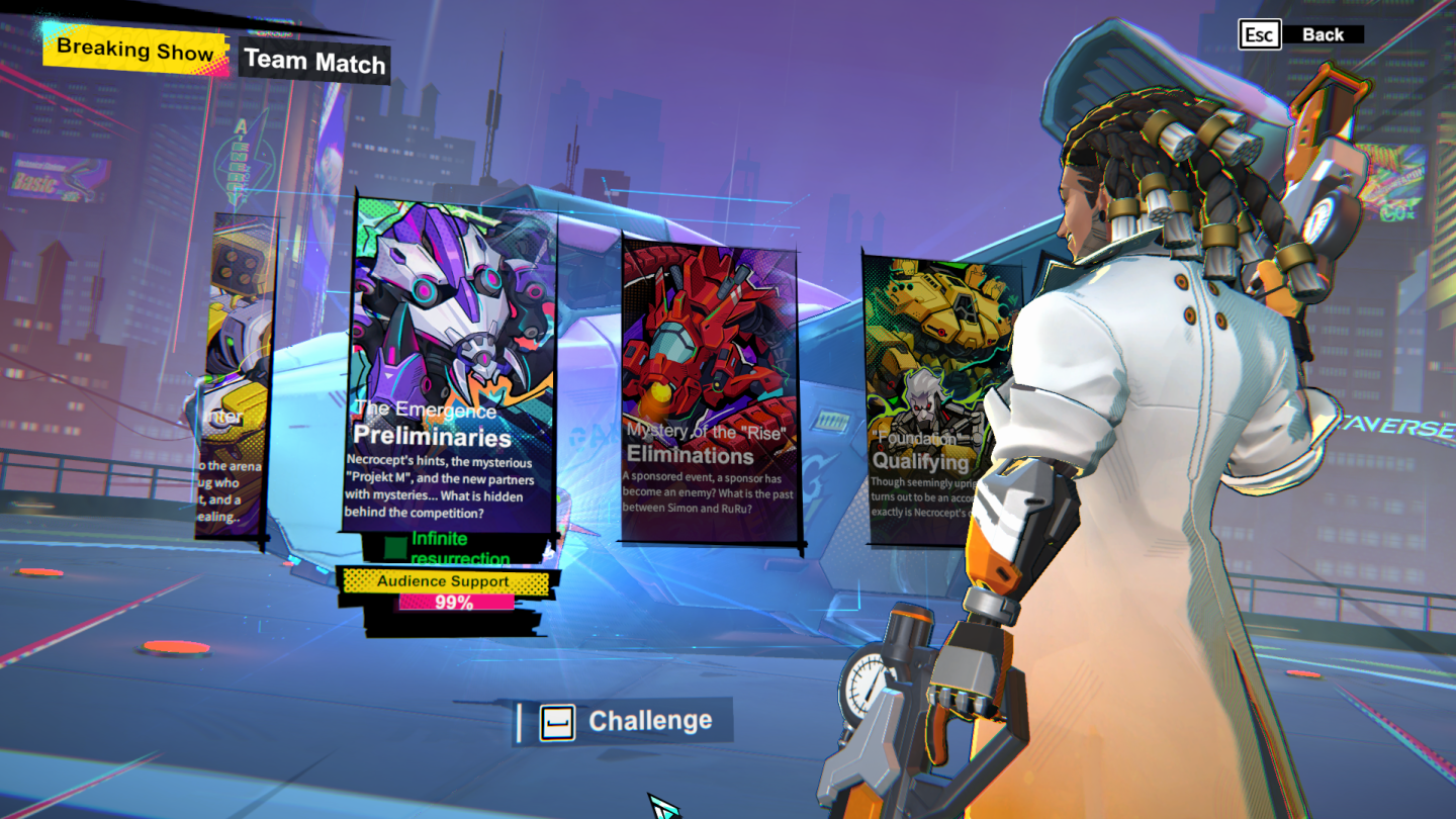 在遊戲中,玩家可針對自己的義體搭載客製化的特殊功能來強化能力,搭配各種武器的強化改造,構築極致暢爽連招與自我獨特戰鬥風格。而身為擁有個人專屬頻道的實境秀參賽者,玩家不只要擊敗對手,還要秀出最華麗耀眼的招式來吸引眾人目光增加粉絲,並滿足賽事贊助商的喜好,藉此來獲得各種助力,讓自己能在這場血腥激烈的殺戮秀中存活到最後。