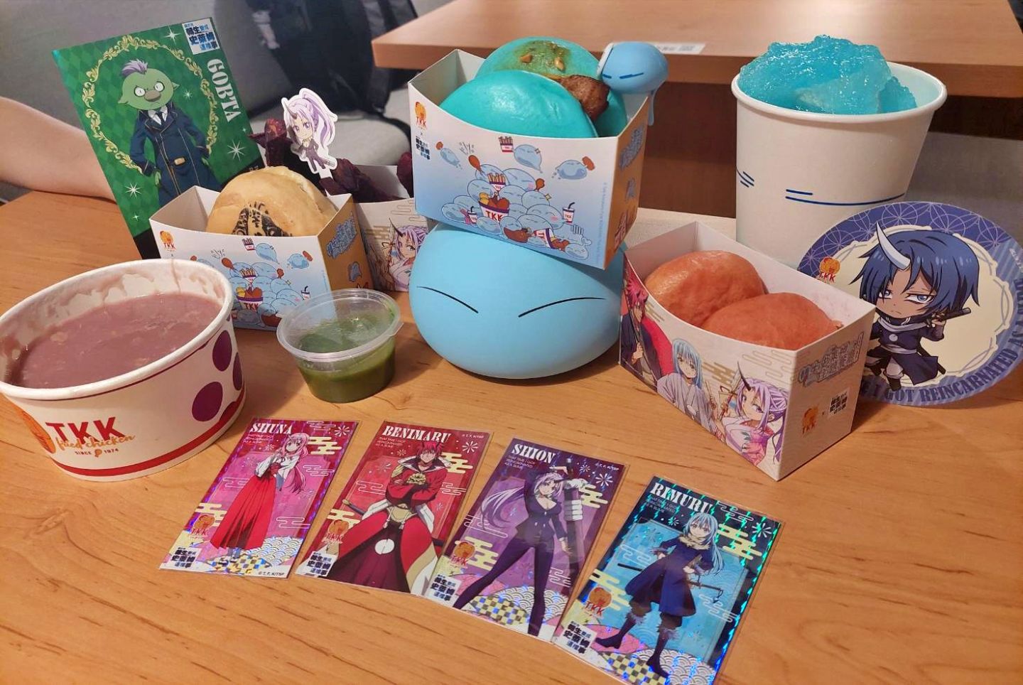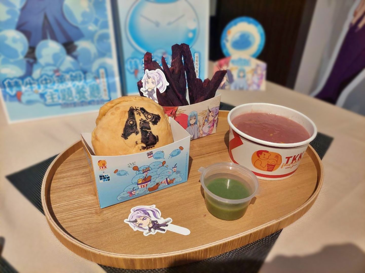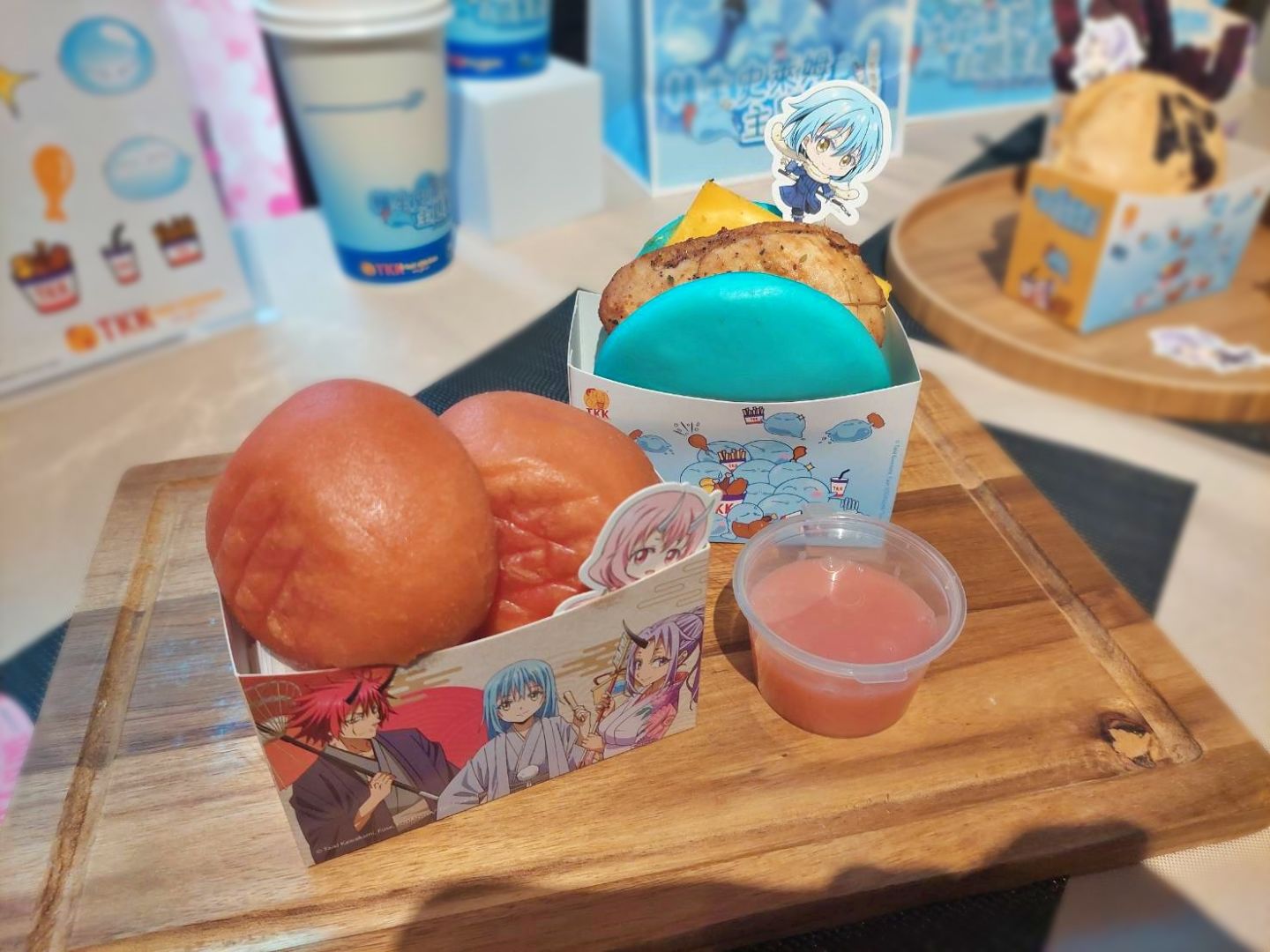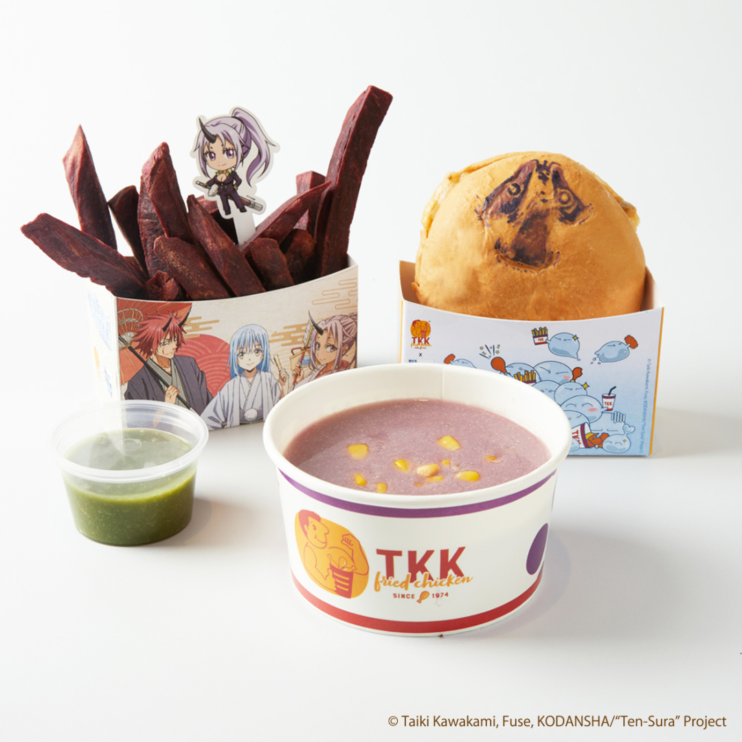 活動限定角色聯名餐點,將頂呱呱明星餐點結合動畫情節,推出「天堂餐」與「地獄餐」,天堂餐內有利姆路雪泥、利姆路捕食刈包、朱菜甜甜包,「利姆路雪泥」有可愛的利姆路紙杯包裝,藍色冰沙由乳酸飲加入藍甘菊調製而成,酸酸甜甜滋味夏天來上一杯超級爽快!「利姆路捕食刈包」用藍色刈包當作漢堡皮,包入台味炸雞及起司片等,外觀像級了萌王本人!「朱菜甜甜包」將甜甜包變成了粉色外觀,淋上草莓煉乳醬,美味可口的「天堂餐」完成!