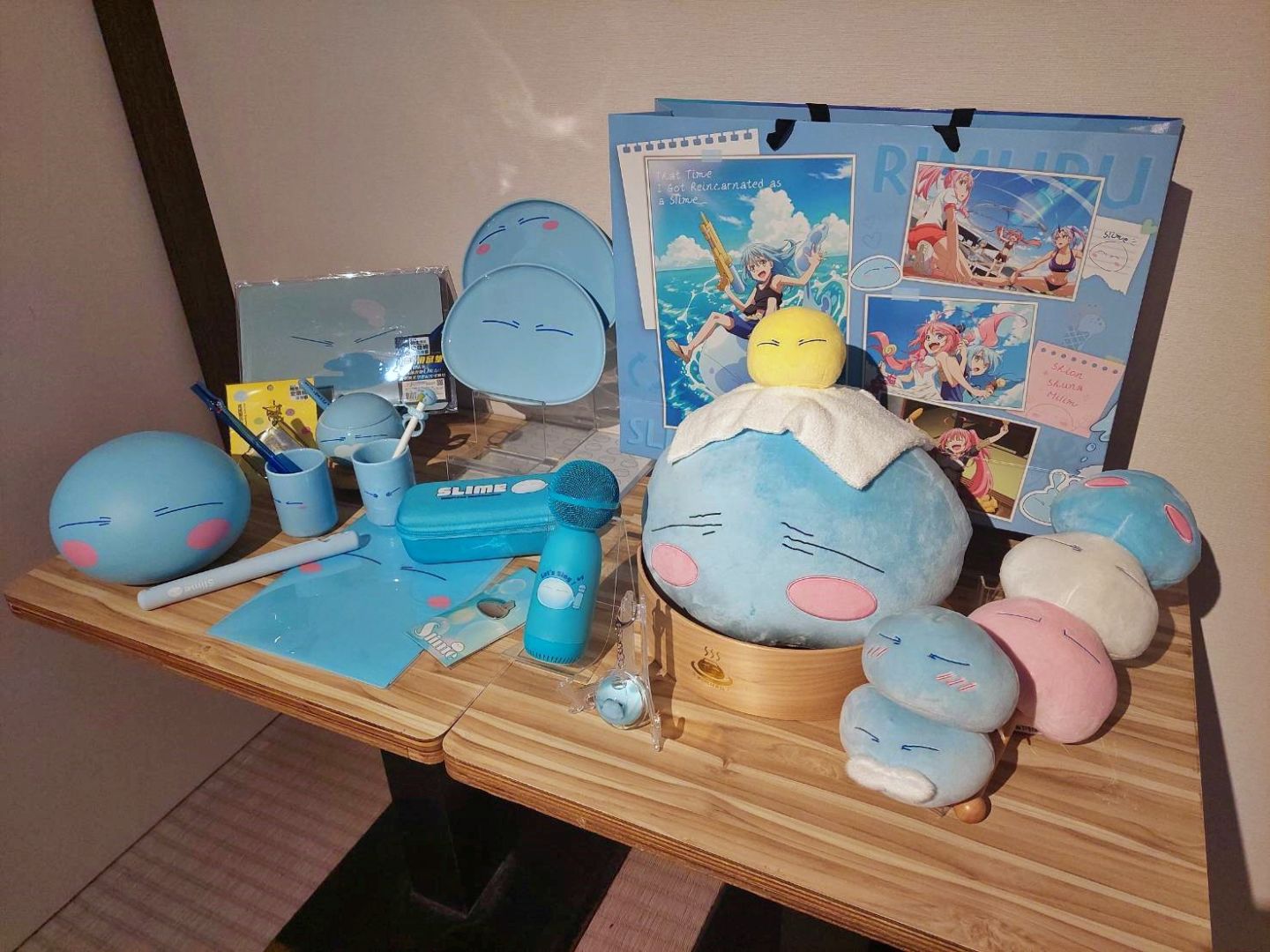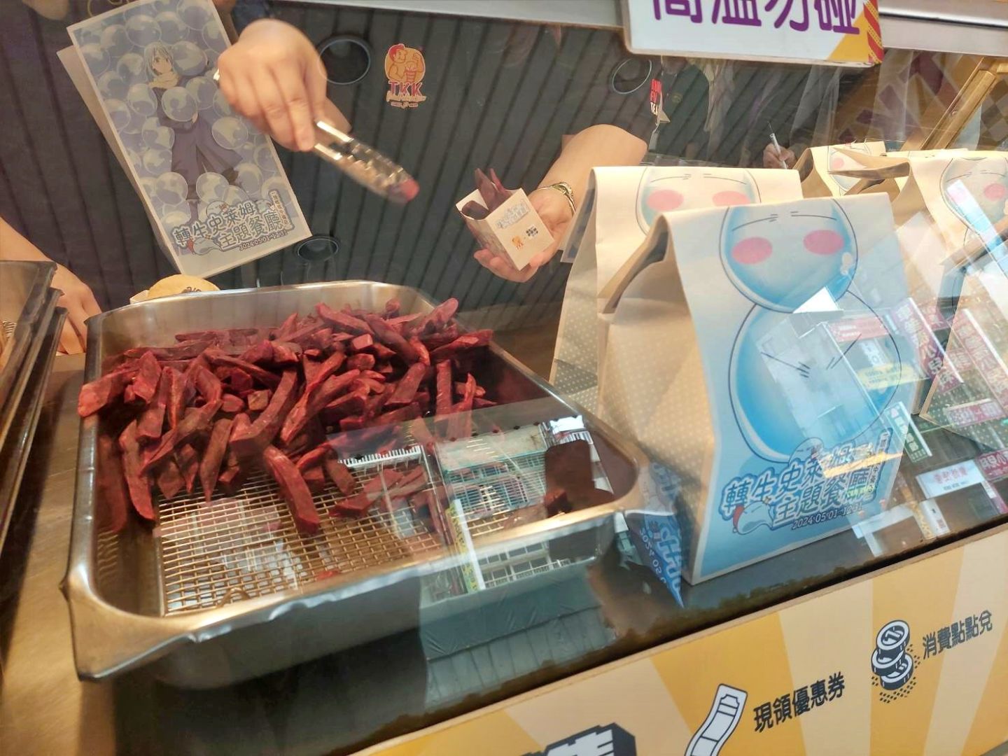「轉生史萊姆主題餐廳」一樓有史萊姆週邊售販區,品項陸續上架多達一百多種,要給粉絲們超多驚喜!期間凡消費聯名餐點,就有機會獲得精美餐墊紙、角色插旗、利姆路造型貼紙等限量小物,另外消費餐飲單筆消費滿$300(需包含聯名限定餐點),即可獲得乙份「每月限量獨家特典」,獨家特典包含角色杯墊(5~6月)、精美雷射票(7~8月)、質感透卡(9~10月)、角色貼紙(11~12月)等,不定期更新不同品項就等你來收藏!另外預計6月份開始更可以加購獨家史萊姆泡麵蓋、吸管套等超精美週邊,數量有限,售完為主,詳細時間依頂呱呱官方粉絲團公布為主。