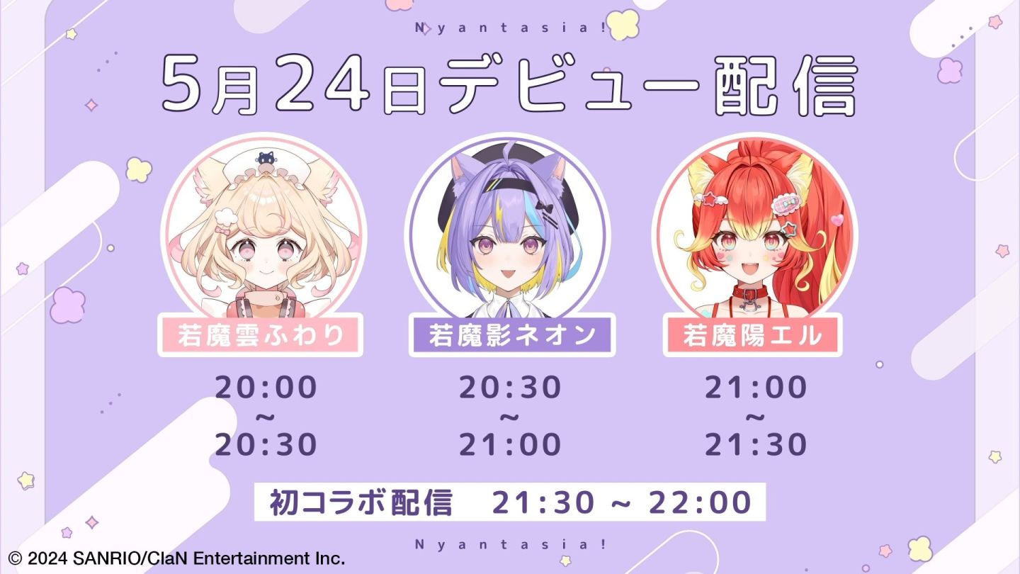 本次發表的三位成員分別是「若魔影 Neon」(若魔影ネオン)、「若魔雲 Fuwari」(若魔雲ふわり)、「若魔陽 Eru」(若魔陽エル),在 5/24 於個別頻道舉辦出道直播後,會聚集到「Nyantasia!」官方頻道舉辦聯動直播,對新人感興趣的話不妨關注她們喔!