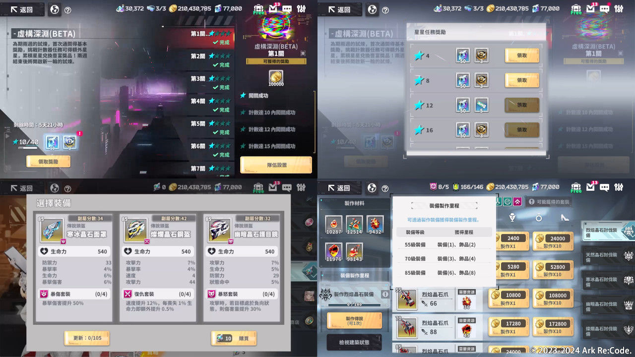 【虛構深淵】是一次 10 層挑戰的關卡,要完成試煉需要擊敗關卡內敵人,會定期更新關卡內容和獎勵。首次通關會獲得基本獎勵,同時達到特定的關卡條件還能額外獲得星星,可以透過【重複進行】來累積星星兌換豐富的獎品!