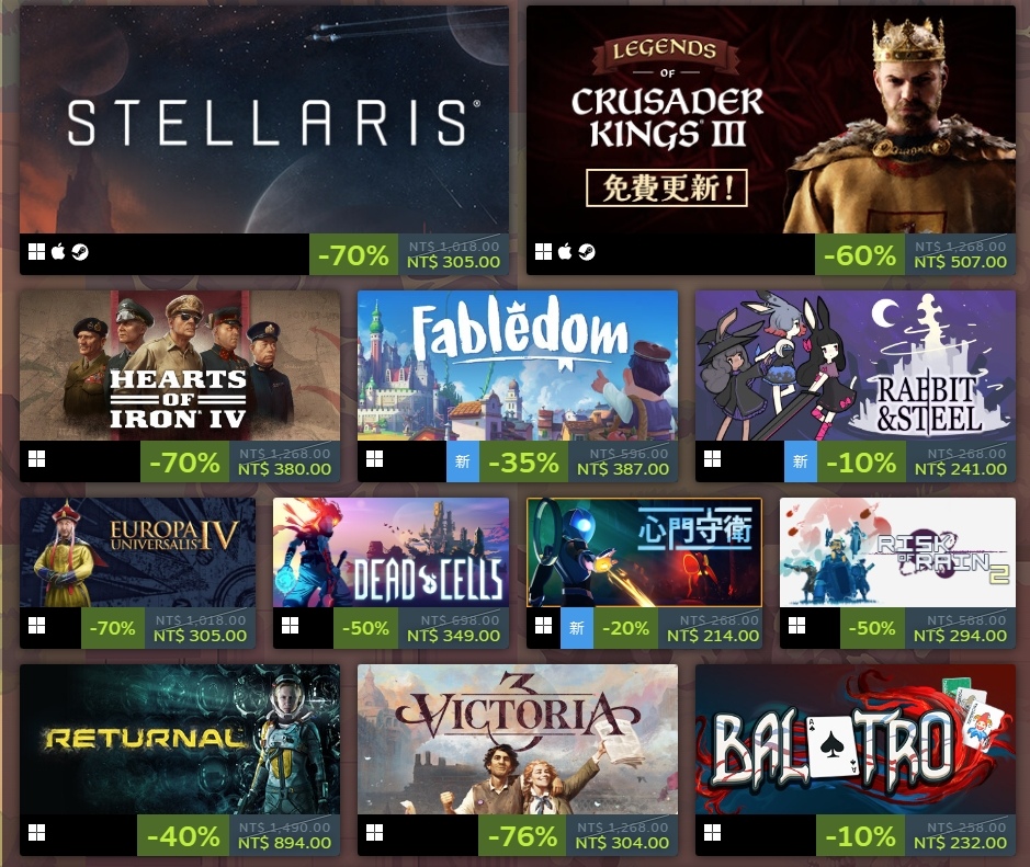 藉由無限重玩節活動推出,許多遊戲也在本次推出相當划算的特價,包括突破歷史新低的《卡牌城鎮 Cardboard Town》《矮人要塞 Dwarf Fortress》,接近或達到史低的《Stellaris》《Unpacking》《Risk of Rain 2》等等,都是這回相當值得注目的遊戲。