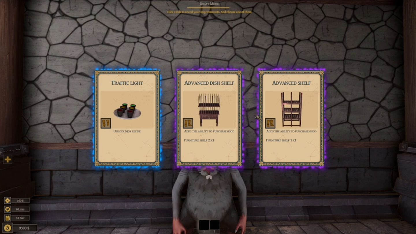 有時餐廳會出現意想不到的貴客,會給玩家帶來各種麻煩,如果能夠滿足他們的要求就可以得到額外的獎金;賺來的錢能用在增加餐廳桌椅、烹飪設備、裝飾品等升級選項,每個工作日結束時還能從設備、料理及配方三張卡片中選擇一項來進行強化。