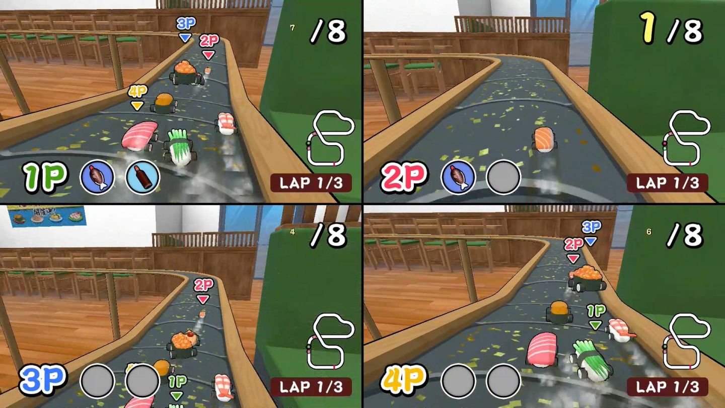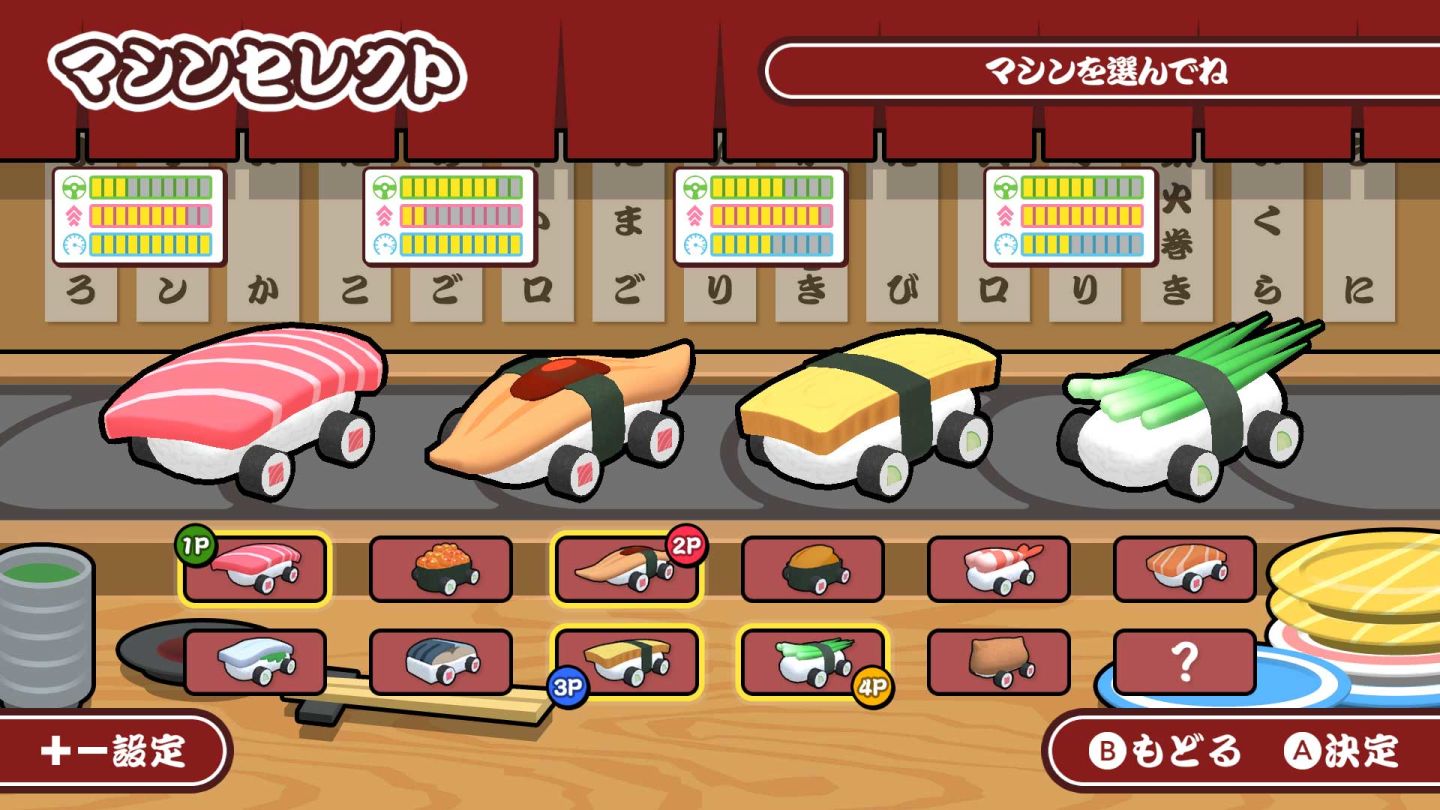 遊戲模式可分為跑出最佳時間的「計時攻擊賽」、與朋友或 CPU 對戰的「自由賽」,以及按照順序跑完所有賽道的「大獎賽」,享受最多四人的遊戲樂趣,與親朋好友比看看誰才是最厲害的壽司車冠軍!