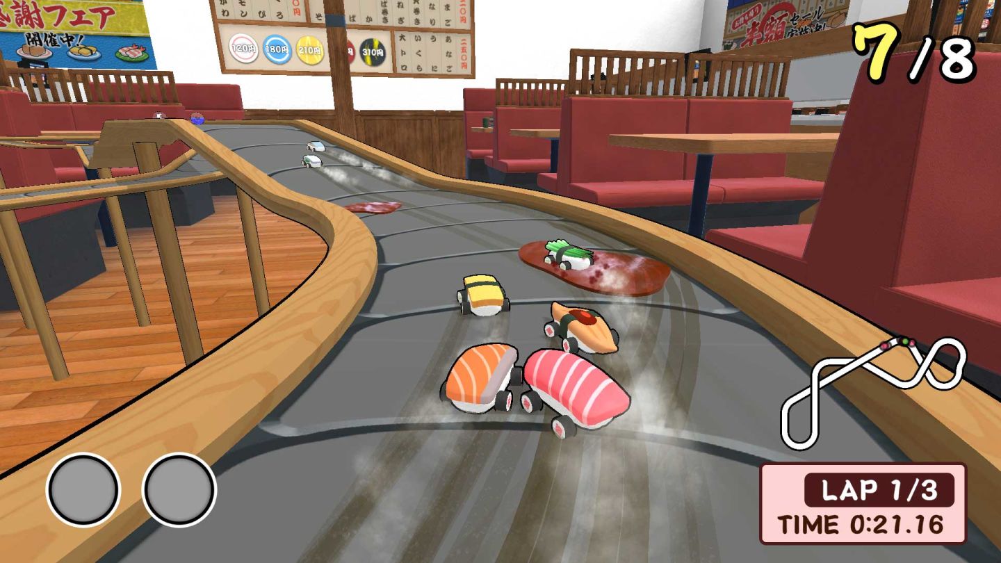 本作顧名思義是一款將壽司結合賽車要素,任何人都能盡情享受的簡單遊戲,玩家可以選擇自己喜歡的壽司車在賽道上奔馳,還能利用像醬油導彈和攔截器等道具來超越對手。