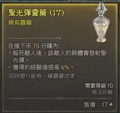 聖光彈靈藥是本季新增的靈藥之一,除了多種打怪掉落途徑之外,也可以使用古幣兌換。聖光彈靈藥擁有與其它靈藥相同的經驗值加成,而它最為暴力的效果,則是喝下的 15 分鐘內,殺死敵人後敵人的屍體會向外發射一圈聖光彈。