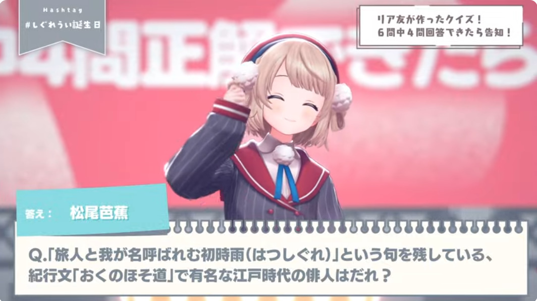 祝賀影片環節結束後,羽衣馬麻就挑戰了朋友製作的問答題,如果 6 題中能答對 4 題就能進行發表,雖然前三題的難度讓羽衣懷疑到朋友是有在看她台?的程度輕鬆回答,但從第四題開始難度明顯提高,最終羽衣只回答出 3 題結束。