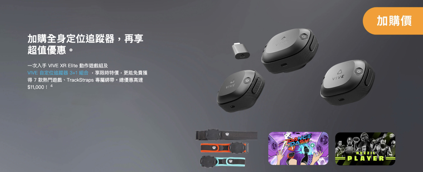 此外,若一次入手「VIVE XR Elite 動作遊戲組」及「VIVE 自定位追蹤器 3+1 組合」,除享有上述折扣優惠及五款精選遊戲外,再獲價值 4,860 元加碼好康。具體優惠內容如下: