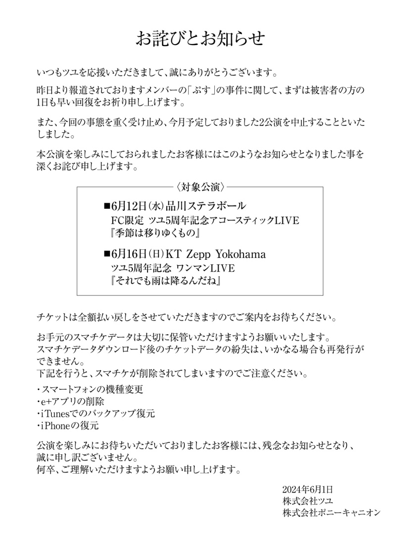 但在 5/31 日,ぷす因涉嫌刺殺女友未遂遭到逮捕,次日 TUYU 的官方 X(原推特)針對此事件發表聲明,取消ぷす的鋼琴演奏專輯發行和原定 6 月舉辦的兩場演出,未來樂隊的活動仍在與相關人員協議中。