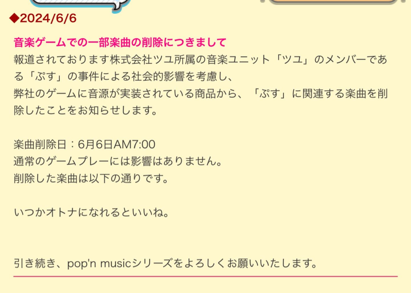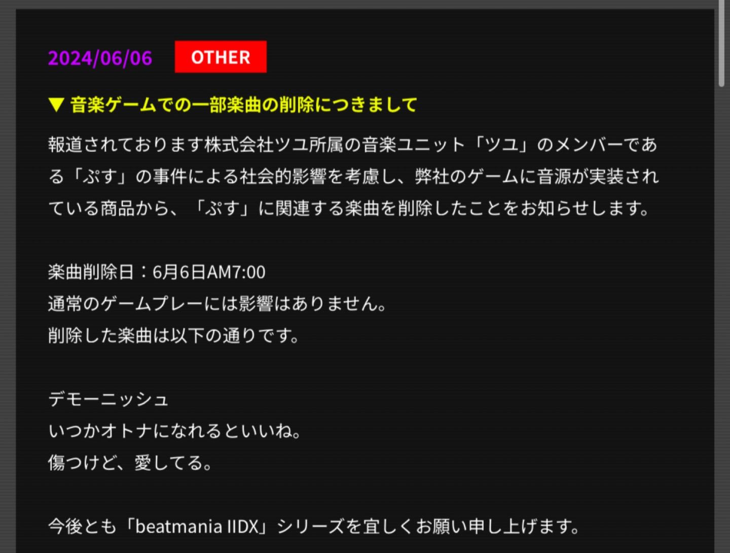 《beatmania IIDX》、《GITADORA GALAXY WAVE》、《pop'n music》、《SOUND VOLTEX EXCEED GEAR》、《jubeat beyond the Ave.》等 KONAMI 營運的音樂遊戲,自今日更新後已刪除收錄的 TUYU 樂曲,各遊戲官網公告上則表明「考慮到社會影響,已從遊戲實裝樂曲中刪除與 TUYU 有關的歌曲」。