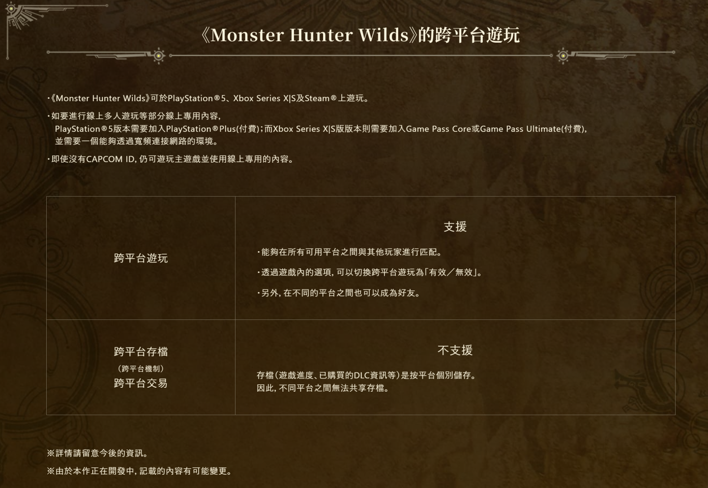CAPCOM 在網路節目「Summer Game Fest」壓軸階段,製作人辻本良三公開了《魔物獵人 荒野》的最新宣傳影片,並宣佈本作將支援跨平台連線配機制,因此 2025 年在 PlayStation 5、Xbox Series X|S 及 PC (Steam)上將同步發售。