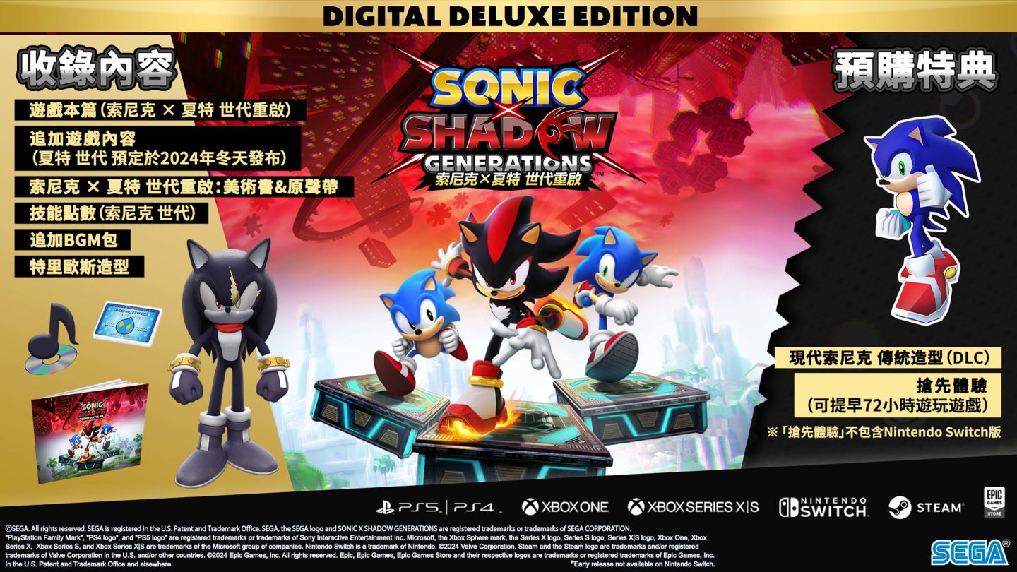 SEGA 世雅宣布,將超人氣角色「索尼克」和黑暗英雄「夏特」的 2 部高速動作冒險合而為一的系列最新作《Sonic×Shadow Generations 索尼克×夏特 世代重啟》,將在 2024 年 10 月 25 日(五)於 PS5/PS4/Nintendo Switch/Xbox Series X|S/Xbox One/PC(Steam/Epic Games Store)平台發售。