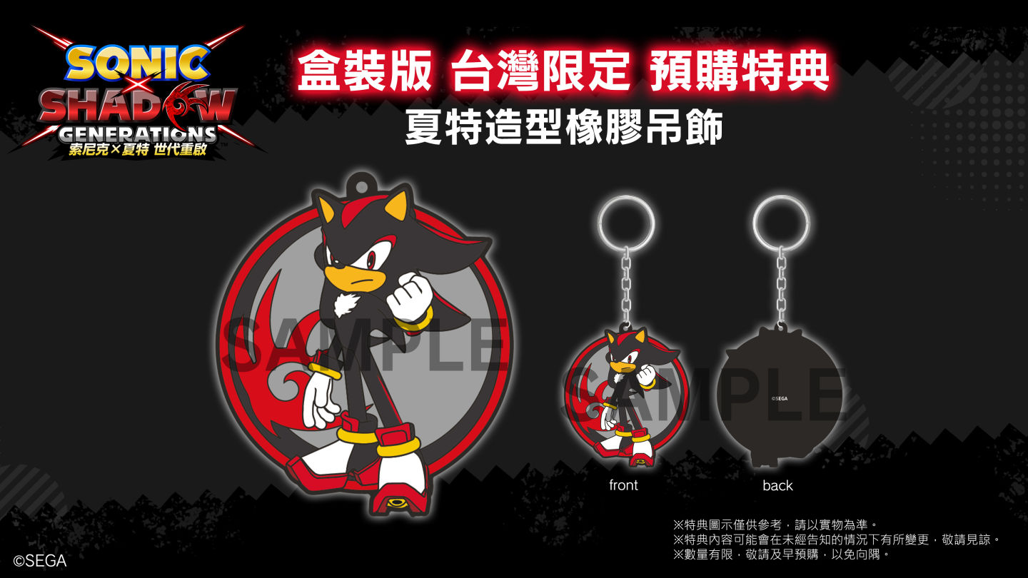 凡預購《索尼克×夏特 世代重啟》PS5/PS4/Nintendo Switch 盒裝版(台灣 TWD 1,290),將有機會獲得台灣地區預購原創特典,「夏特造型橡膠吊飾」。帶上吊飾和黑暗英雄夏特一起展開冒險吧!數量有限,欲購從速。