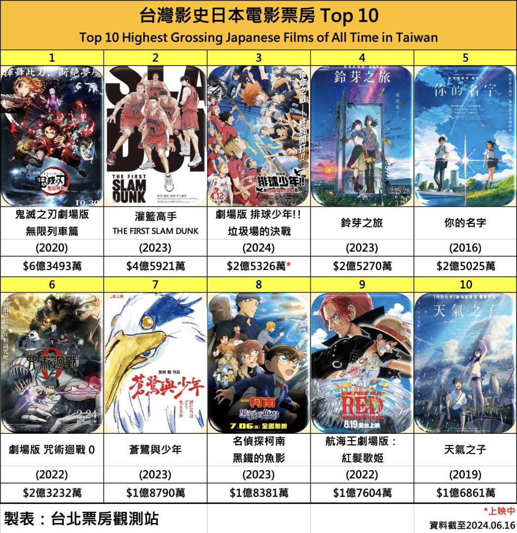 上星期榮登 2024 年度全台票房冠軍的電影版《排球少年!!垃圾場的決戰》於 6/16(日)上映中文配音版與推出繁體中文版特典「音駒番外篇!! 33.5 再來一次!」雙雙助攻的威力下,票房直衝 2 億 5357 萬 2,366 元,正式成為繼《鬼滅之刃 劇場版 無限列車篇》與《灌籃高手 THE FIRST SLAM DUNK》之後的台灣影史日本電影票房第三名。