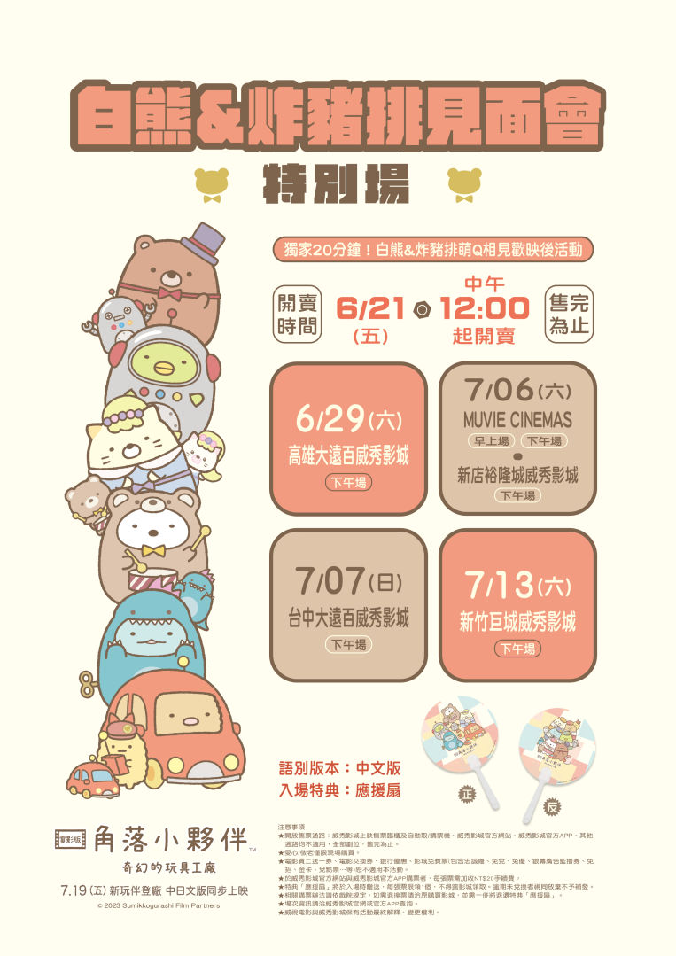 延續前兩集電影版提供給台灣觀眾的福利,《角落小夥伴電影版:奇幻的玩具工廠》將再度邀請角落小夥伴來台與粉絲相見歡,「玩偶」白熊及「遙控車」炸豬排以最新造型首次登台!6/29 至 7/13 的週末期間舉辦合計 8 場「白熊&炸豬排見面場」,不僅可以搶先觀賞電影,還可與白熊和炸豬排進行映後 20 分鐘的「萌Q相見歡活動」,除了親子同歡的問答小遊戲外,還有機會抽中精美的周邊小禮!此外,凡購買「白熊&炸豬排見面場」電影票乙張,入場時即發送「獨家應援扇」乙支。座位有限,售完為止。此見面場將於本週五(21日)中午 12 點起於威秀影城及 MUVIE CINEMAS 現場售票臨櫃、威秀影城官網及威秀影城官方 APP 正式開賣。