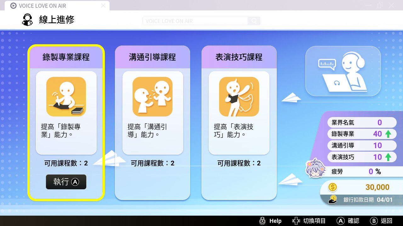 透過學習可提升能力屬性,課程名稱對應同名屬性。「可用課程數」充足的情況才可「執行」學習。業界名氣只能通過錄製專案獲得。可用課程數不足時,可在商城購買課程訓練券。