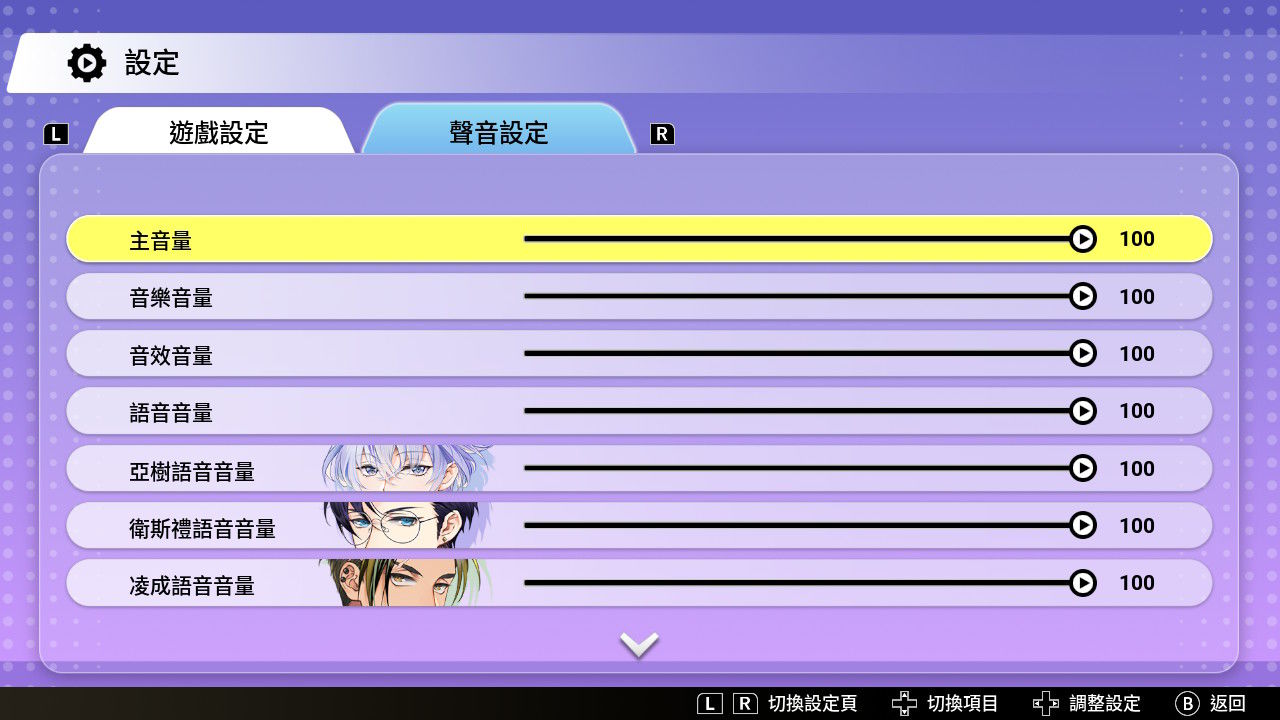 遊戲語言、啟動工作室應門事件、文字自動撥放、排程動畫速度、文字顯示速度,系統音量及個別角色音量大小等,皆可在此進行調整。