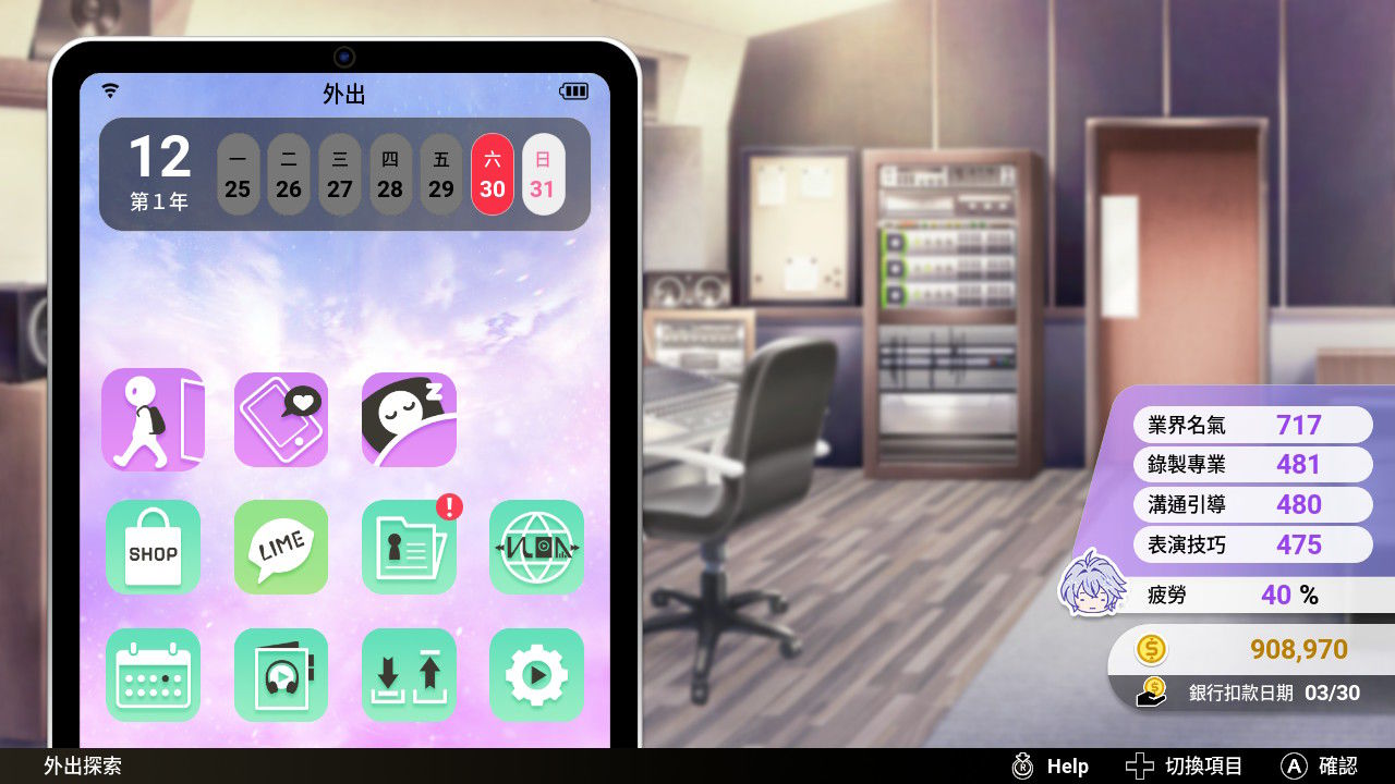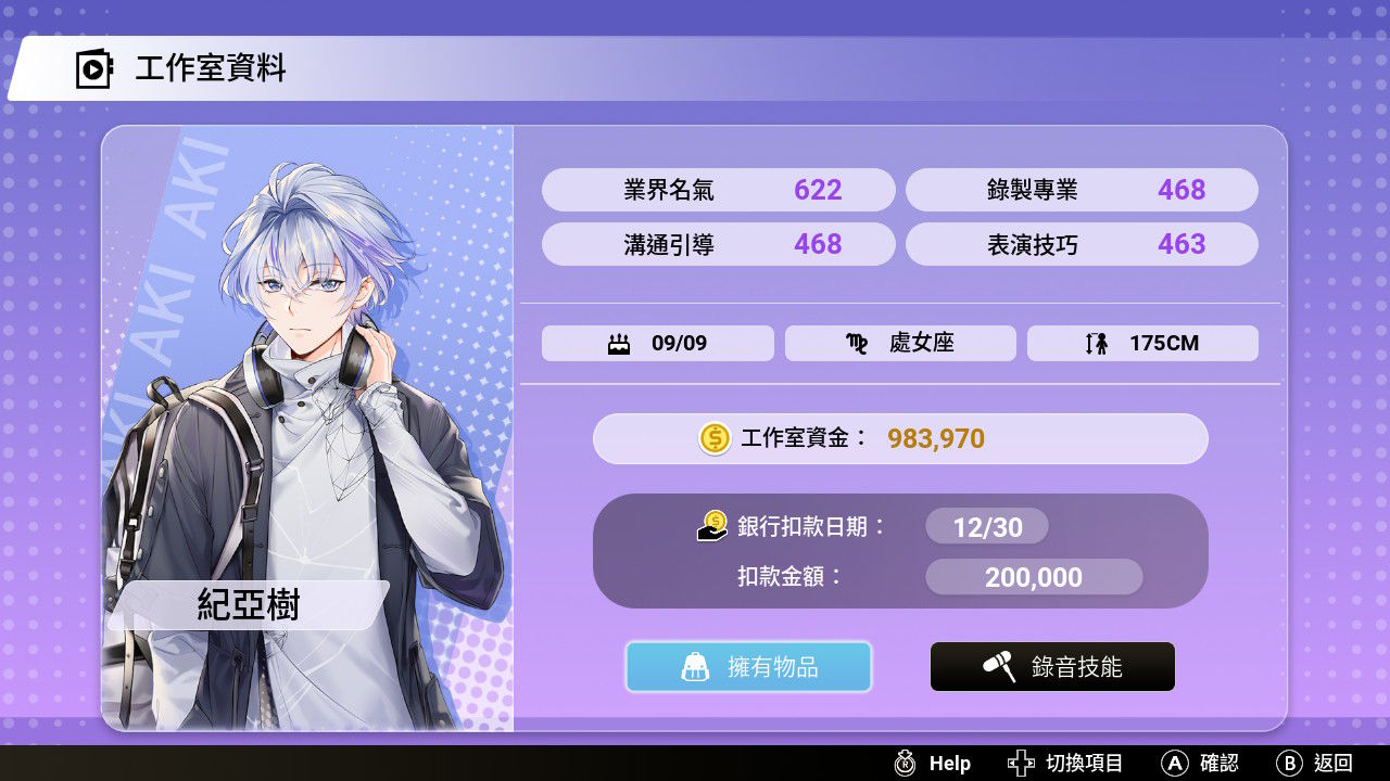 右方為亞樹的簡易能力屬性,詳情可在「工作室資料」查看。疲勞會影響行動成功率,請注意健康狀態。工作室當前資金及銀行扣款日期。銀行扣款日期若資金不足,會導致工作室破產!