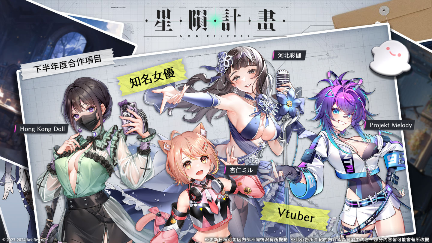 有關下半年度的合作項目,星隕計畫團隊邀請華人圈知名網紅「HongKongDoll」以及日本人氣 AV 女優「河北彩伽 」進到遊戲中與團長們互動。有著香港極品美少女之稱的 HongKongDoll 將會化身為可愛的陪玩小姐來陪伴玩家,以及最強 SS 級的女優河北彩伽也將作為頂級偶像登場於星隕計畫。