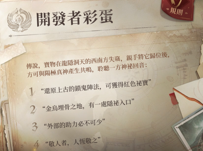 來自開發者的一封信提到:【龍隱洞天】的西南方據傳有一件寶物失竊,各位玩家需齊心協力,通過破譯謎題找到寶物的線索,進行探索與解密。在8月2日前成功解鎖彩蛋的玩家將會獲得神秘獨特的超級大獎勵!