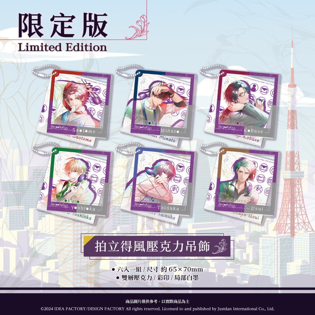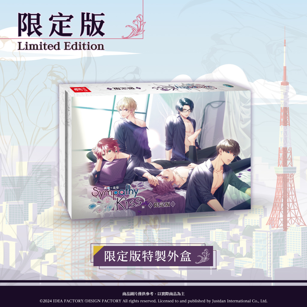 此次《SympathyKiss 共鳴之吻》中文版限定特典除了特製外盒,還包含了特典小冊子、2 部特典廣播劇(附中文台詞本)、Q版貼紙、特殊光閃工藝明信片以及拍立得風壓克力吊飾等,讓玩家們能夠更融入於遊戲的世界中。此外,亞洲版還收錄了遊戲音樂原聲帶,就是要讓各位玩家收穫滿滿,好盡情享受這場連續劇般的職場甜蜜戀情!