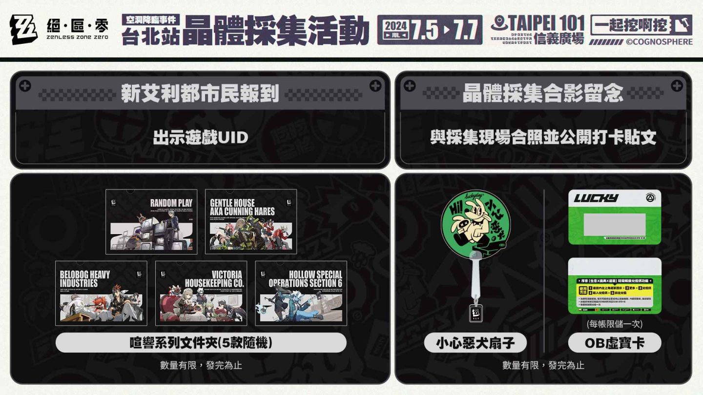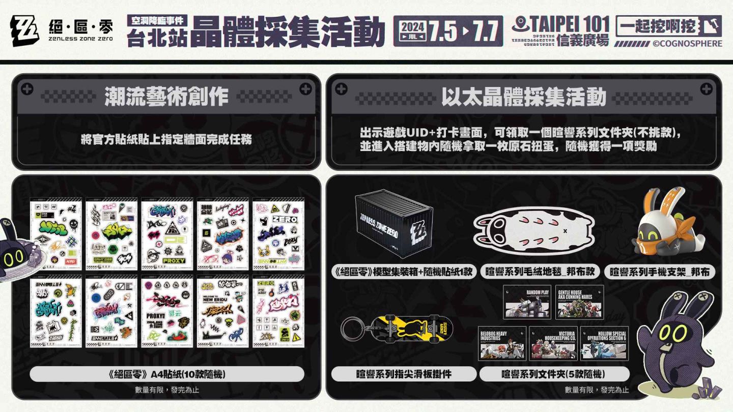 《絕區零》宣布自即日起至 7 月 7 日在台北 101 信義廣場舉辦為期三日的線下主題活動「空洞降臨事件」,邀請各位繩匠來活動現場完成指定任務獲得豐富遊戲周邊獎勵!