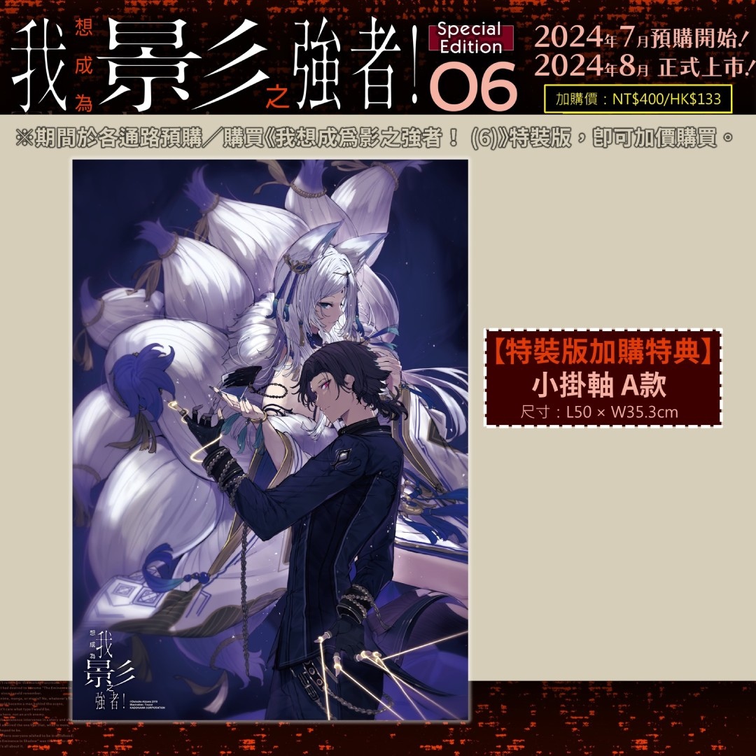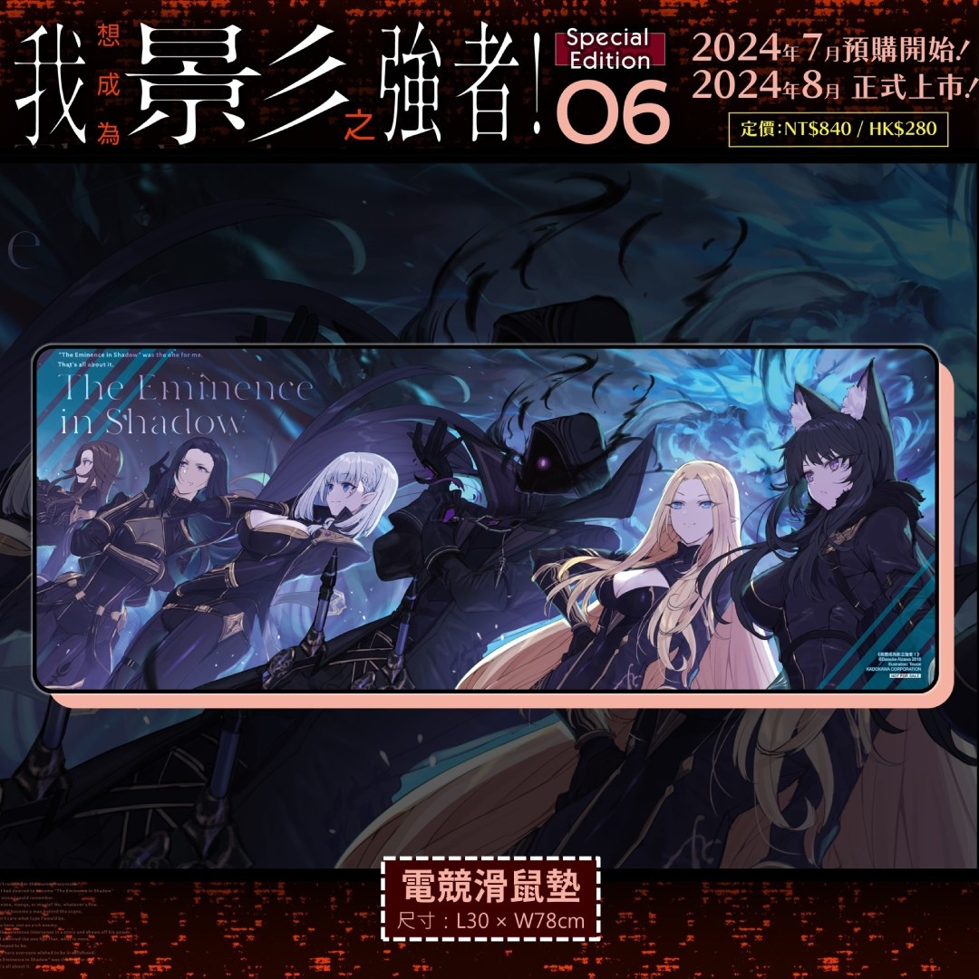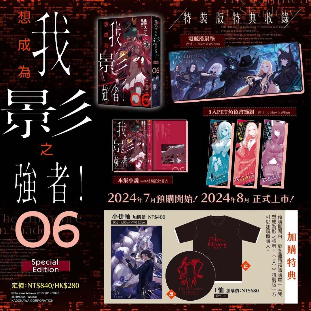 《我想成為影之強者!(6)》特裝版以「特裝版珍藏書盒」收錄特典:電競滑鼠墊、3 入 PET 角色書籤組、本集小說with特別書衣。即日起於全台指定實體通路與台灣角川官網開放事前預購至 7 月 16 日(二),預定八月底發售。