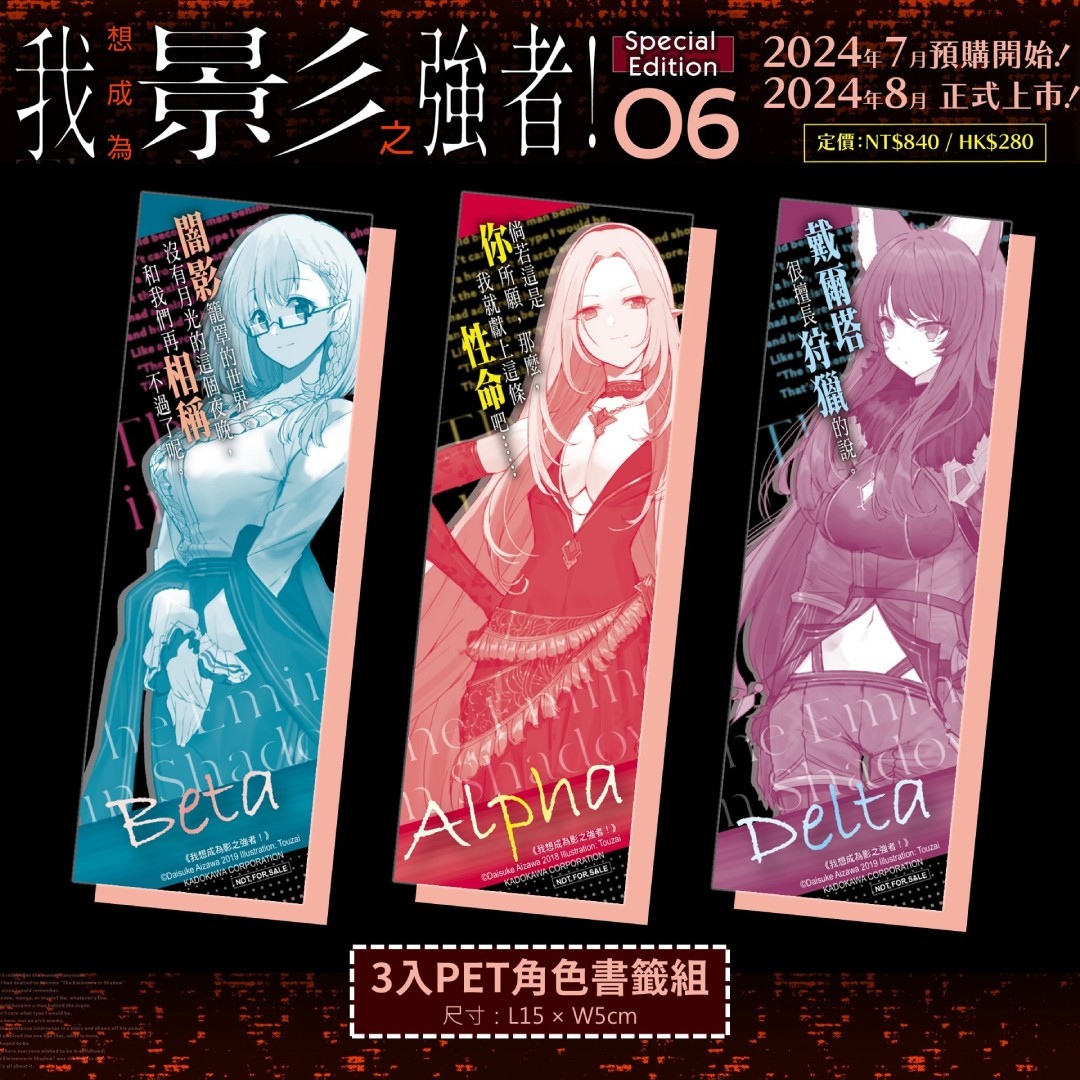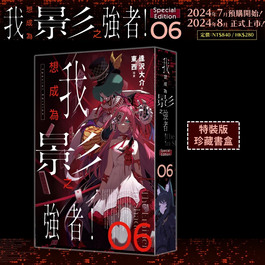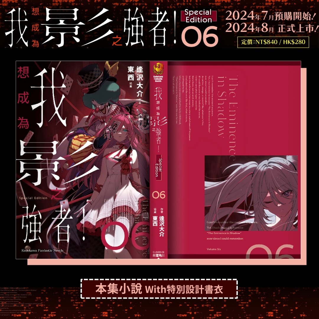 《我想成為影之強者!(6)》特裝版以「特裝版珍藏書盒」收錄特典:電競滑鼠墊、3 入 PET 角色書籤組、本集小說with特別書衣。即日起於全台指定實體通路與台灣角川官網開放事前預購至 7 月 16 日(二),預定八月底發售。