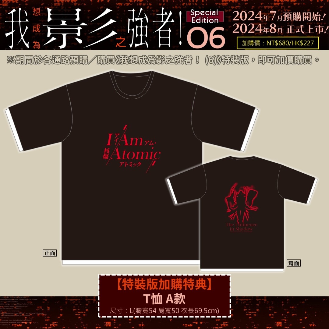 同步推出兩款加購特典:「闇影大人T恤」黑×紅經典配色,搭配施放絕招時的名言「I Am Atomic」超狂珍品絕不能錯過!以及散發角色神秘帥氣魅力的「小掛軸」,活動期間預購/購買特裝版即可加價購買限定特典。於台灣角川官網完成特裝版預購,再加碼贈送官網購物金 100 元,更多活動詳情請至官網查詢。特裝版上市後數量有限售完為止,有興趣的讀者請把握預購期間,以免向隅。