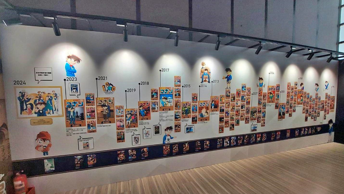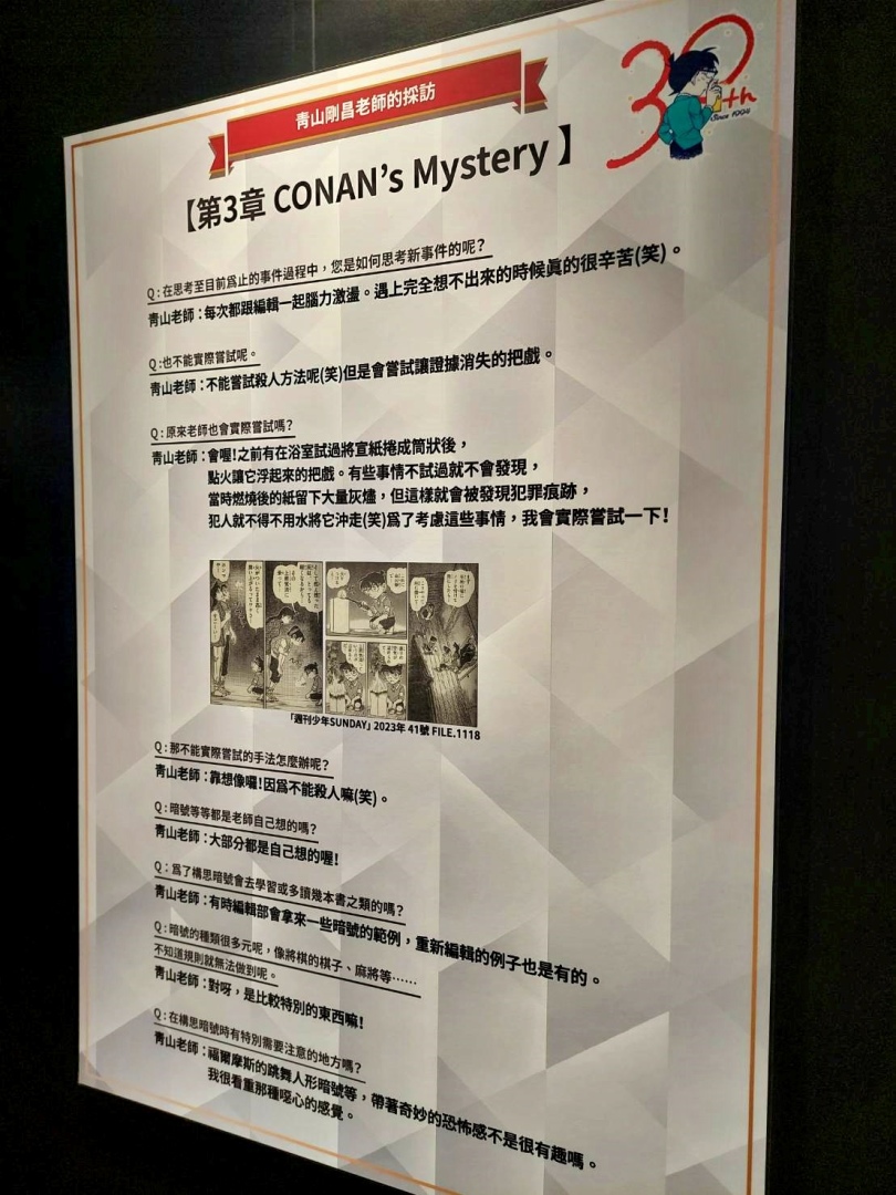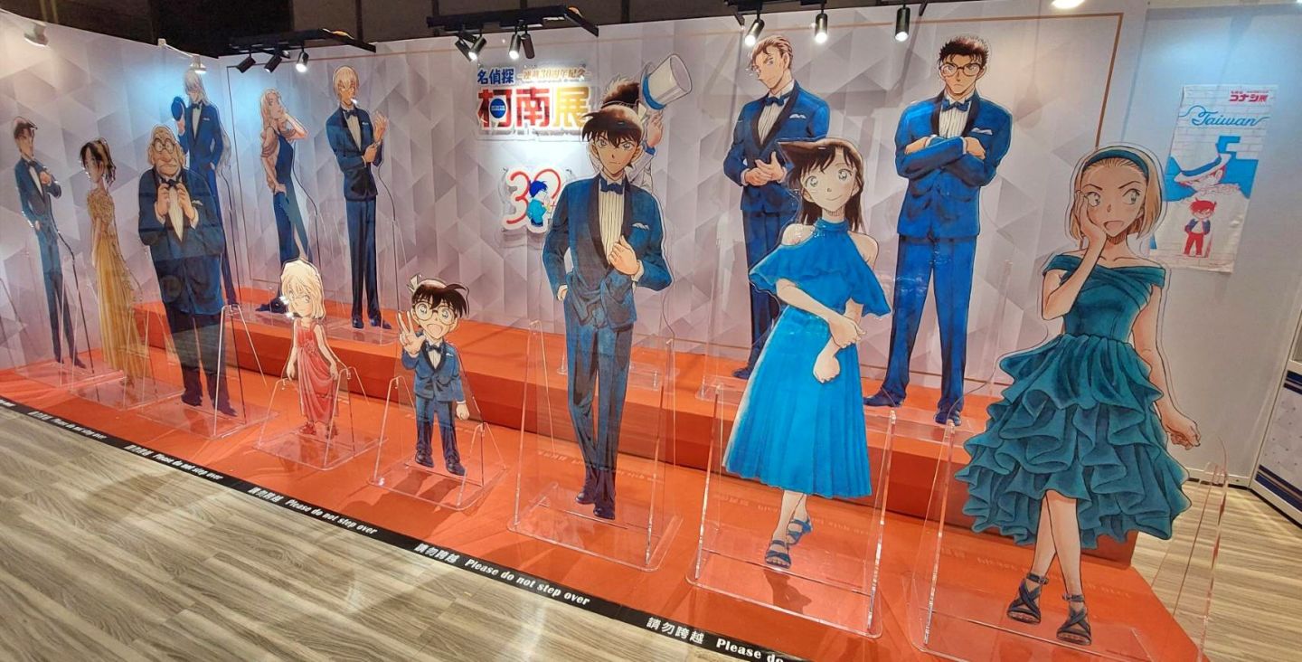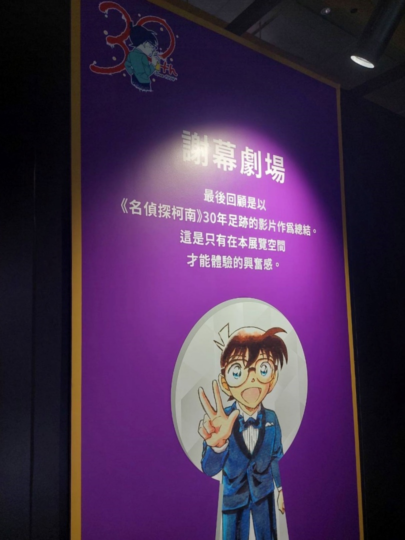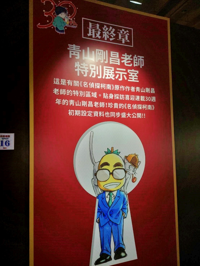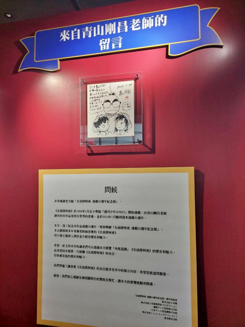 展場首先以青山剛昌老師的留言、來自小學館及作品相關單位的特別問候,還有老師為台北展期特別繪製的簽繪版開頭;接著可以看到柯南 30 週年的立像,就站在許多彩稿圖前面,這裡的每一張彩稿都值得細細品味,回憶每一個柯南及劇中角色的帥氣時刻。另一面則有《名偵探柯南》的大事年表,從漫畫單行本一年推出的集數、每年上映的電影版、以及近年來開始豐富支線的外傳作品,可以確實感受到《名偵探柯南》的世界還在快速開展!