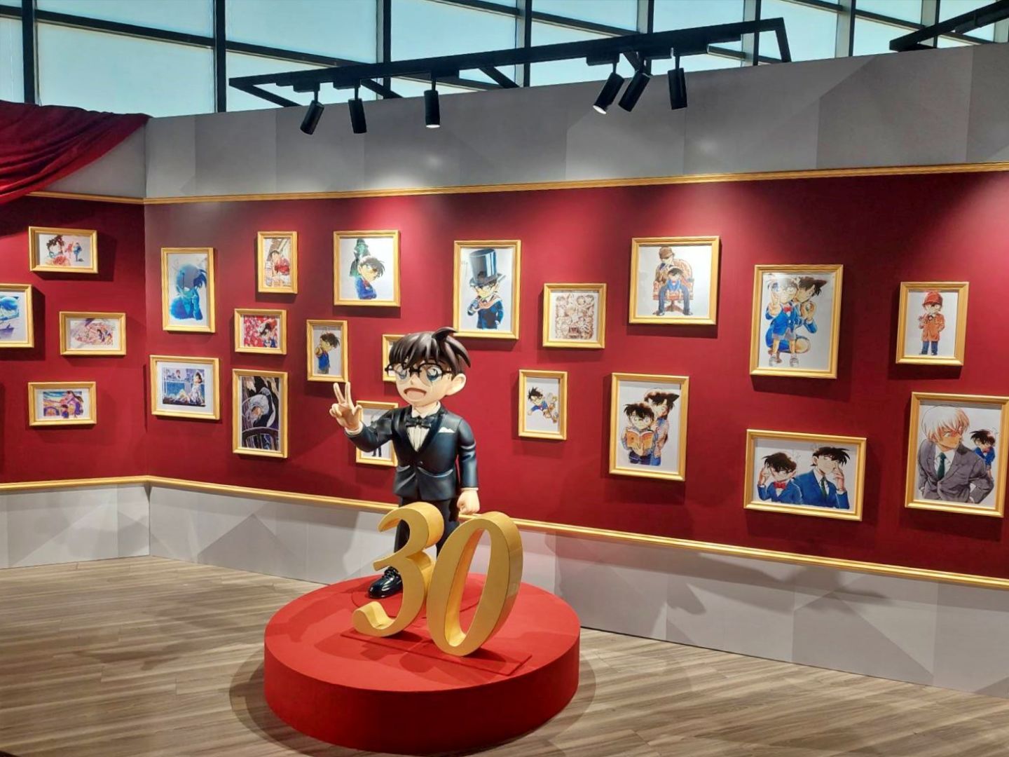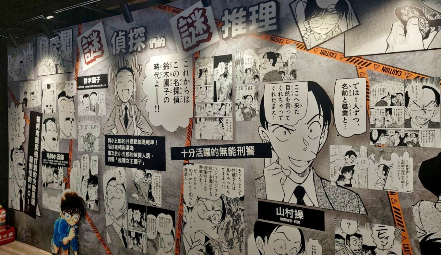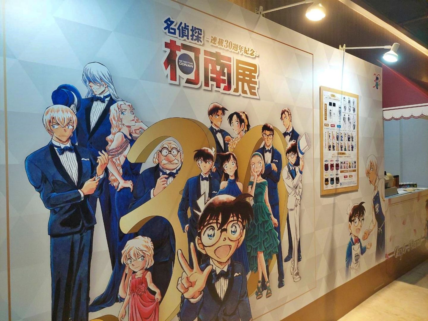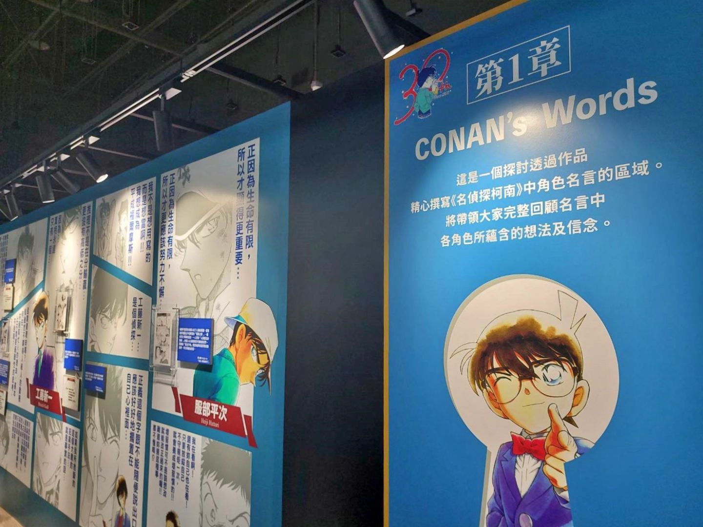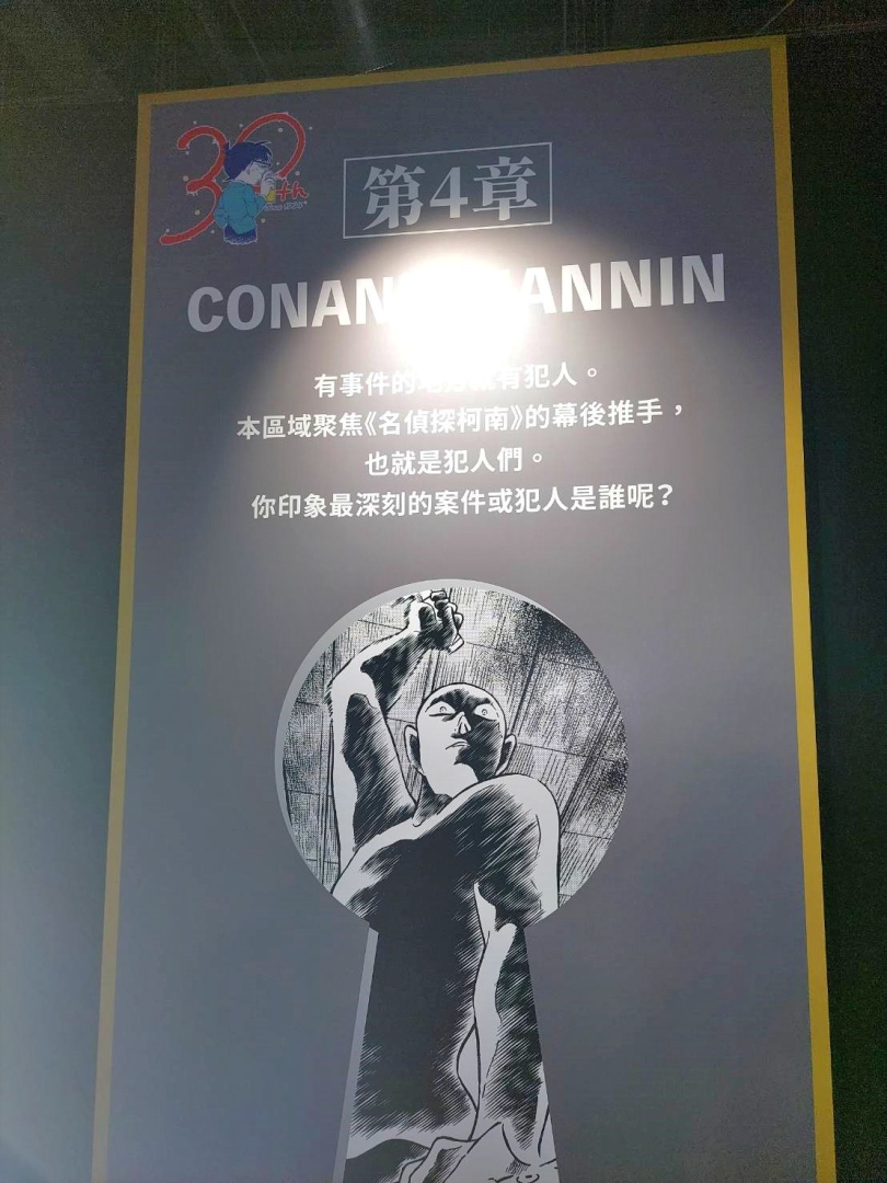 展場首先以青山剛昌老師的留言、來自小學館及作品相關單位的特別問候,還有老師為台北展期特別繪製的簽繪版開頭;接著可以看到柯南 30 週年的立像,就站在許多彩稿圖前面,這裡的每一張彩稿都值得細細品味,回憶每一個柯南及劇中角色的帥氣時刻。另一面則有《名偵探柯南》的大事年表,從漫畫單行本一年推出的集數、每年上映的電影版、以及近年來開始豐富支線的外傳作品,可以確實感受到《名偵探柯南》的世界還在快速開展!