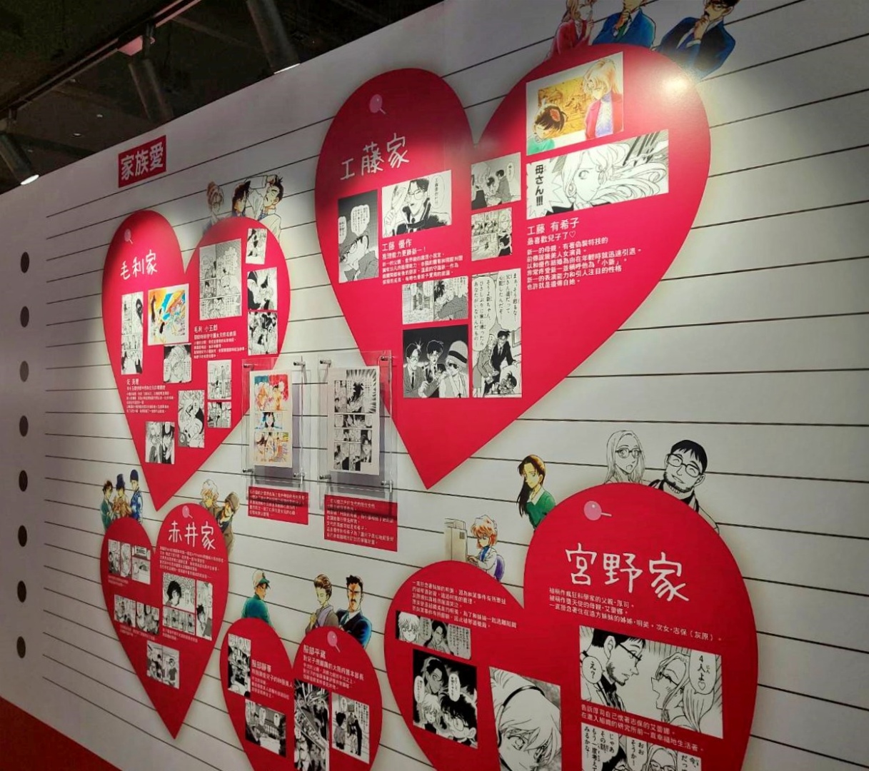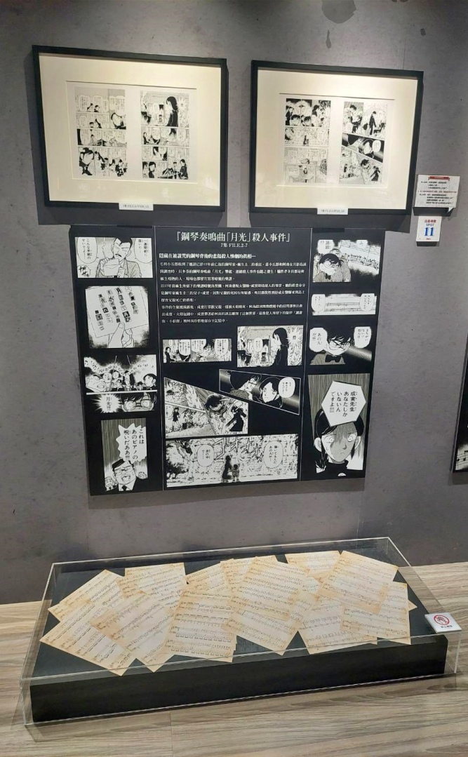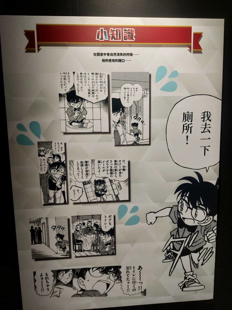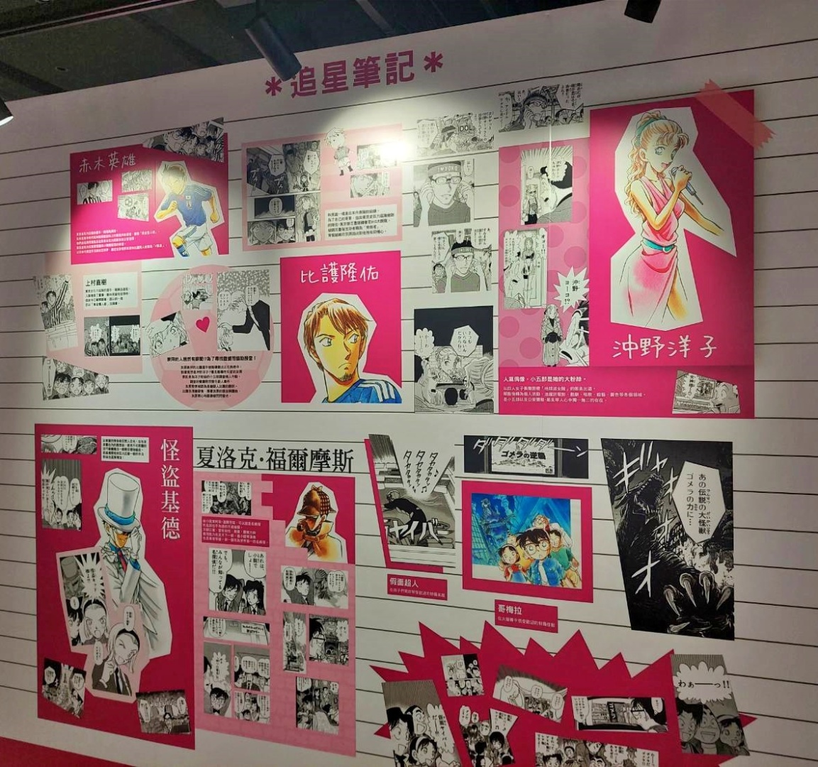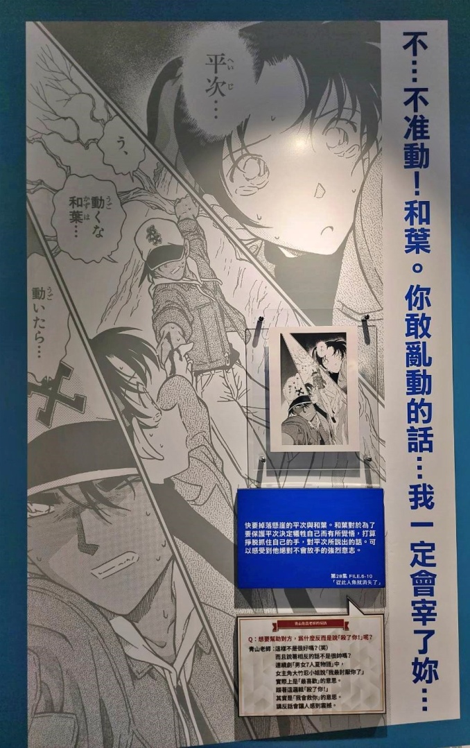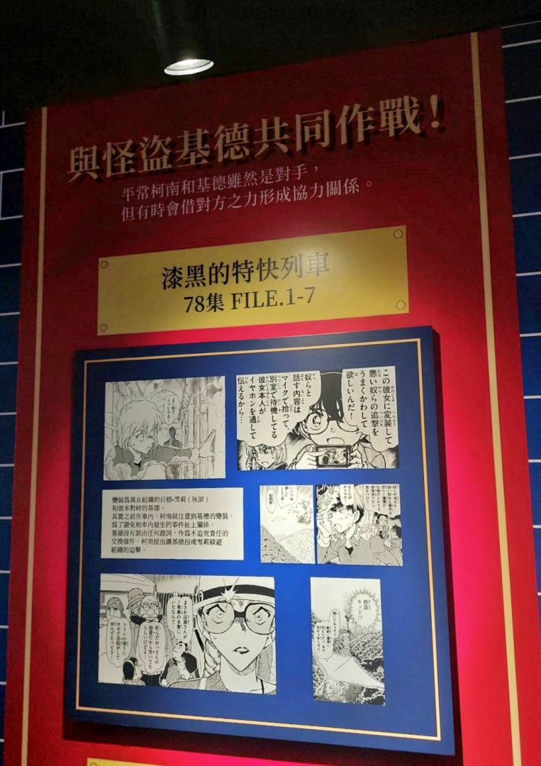 第二個展區「CONAN's Love」,顧名思義解析劇中主要配對的交往過程及兩人對彼此的心情,不過也把廣義上的「愛」像是崇拜、家人之間的愛也都包括進去,另有一整面的「心動牆」,可以看到漫畫中每個粉紅色的心動時刻;第三個展區「CONAN's Mystery」以作品中的解謎要素為焦點,同時還公開黑衣組織到目前為止的全部情報!實在是一個非常值得仔細研究的展區......至於青山老師對於暗號設計的分享也非常有趣,這方面建議大家好好觀賞!