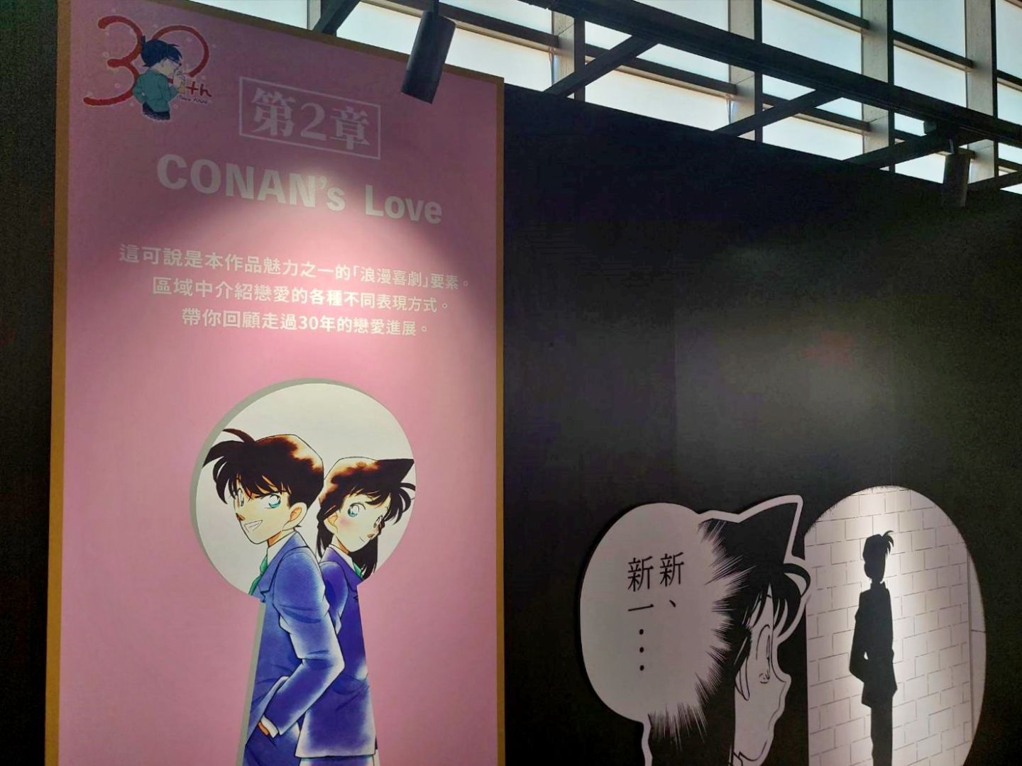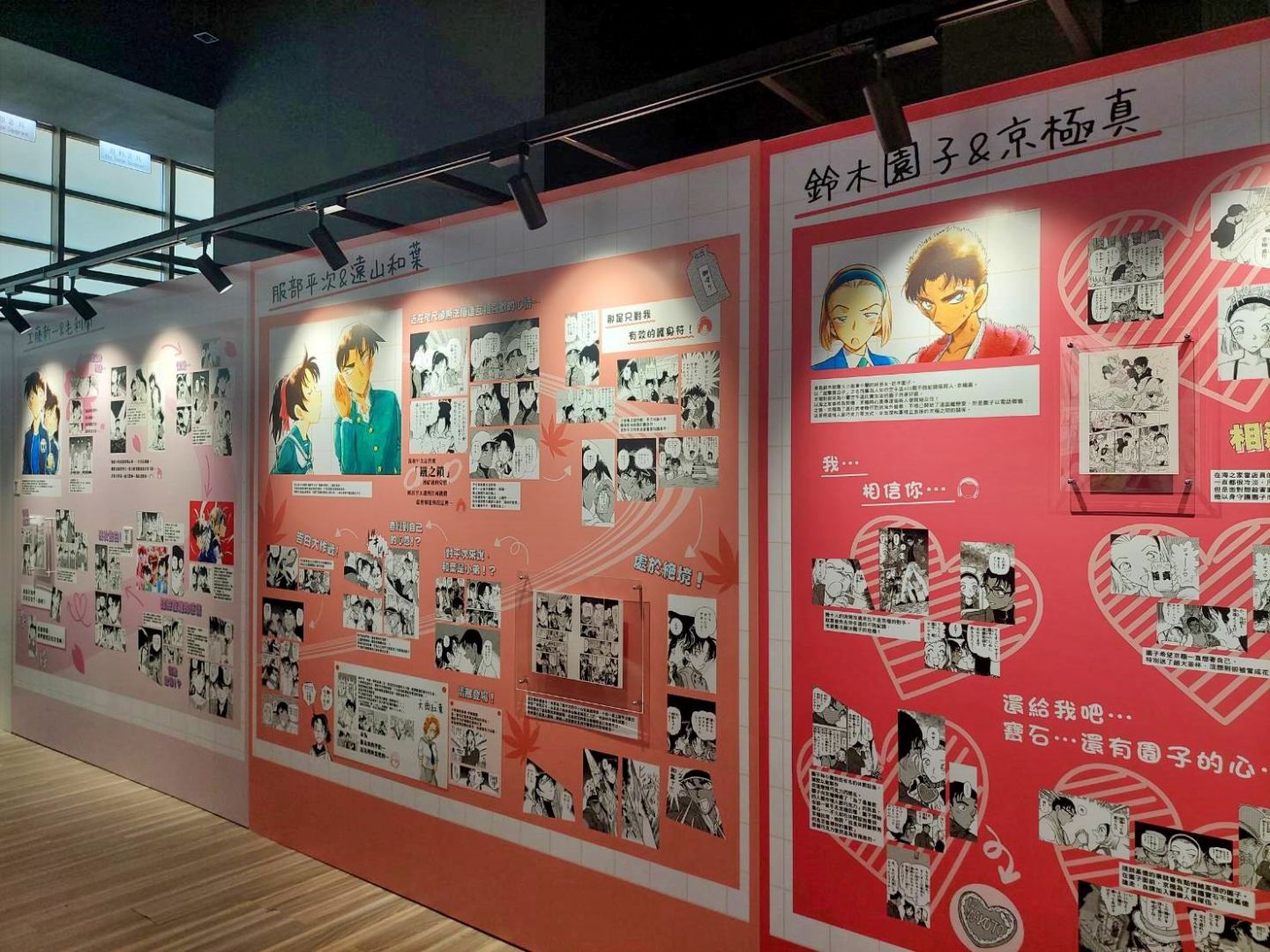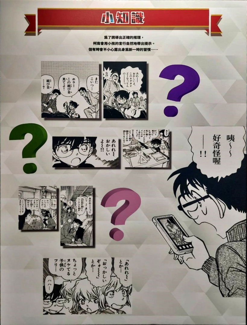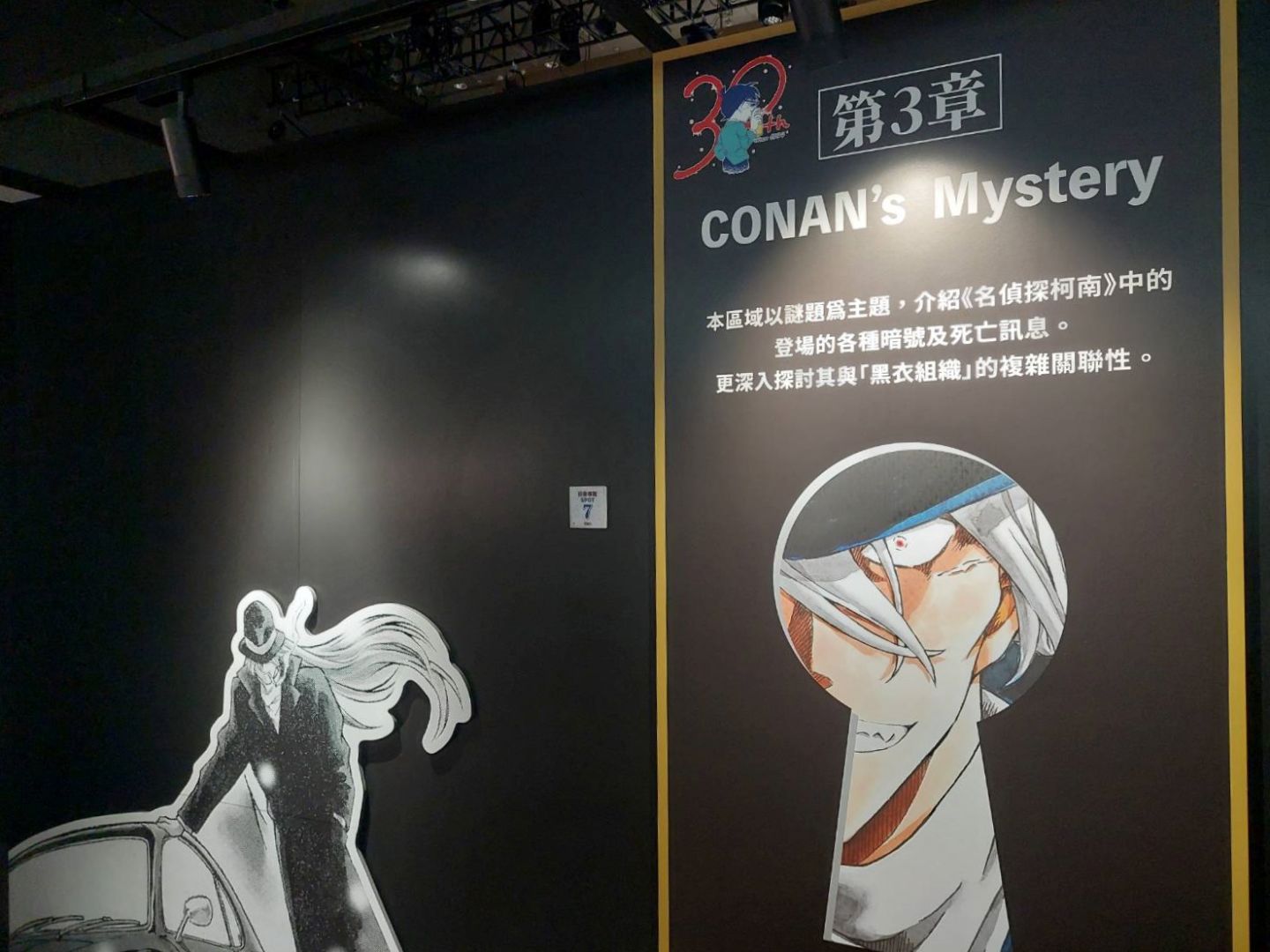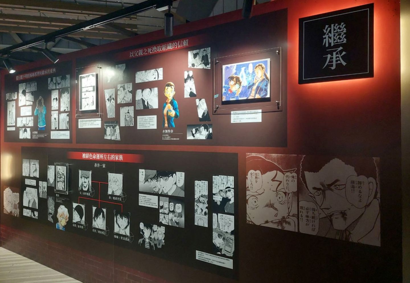 第二個展區「CONAN's Love」,顧名思義解析劇中主要配對的交往過程及兩人對彼此的心情,不過也把廣義上的「愛」像是崇拜、家人之間的愛也都包括進去,另有一整面的「心動牆」,可以看到漫畫中每個粉紅色的心動時刻;第三個展區「CONAN's Mystery」以作品中的解謎要素為焦點,同時還公開黑衣組織到目前為止的全部情報!實在是一個非常值得仔細研究的展區......至於青山老師對於暗號設計的分享也非常有趣,這方面建議大家好好觀賞!