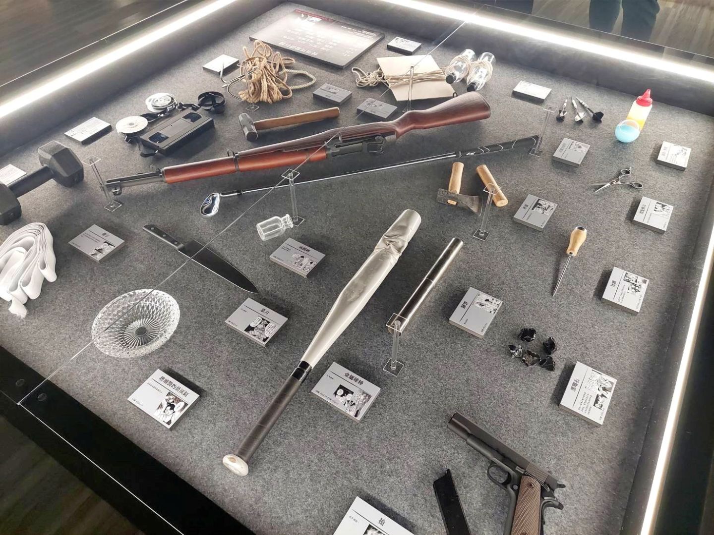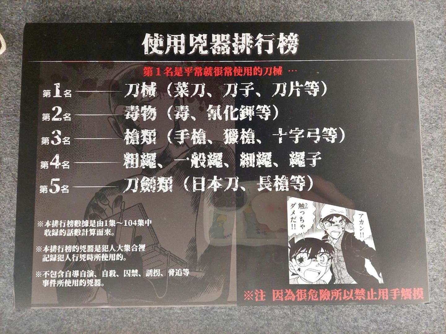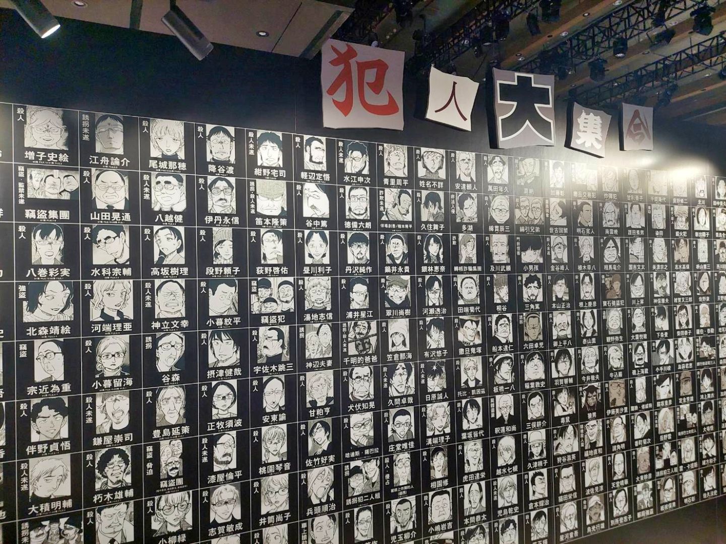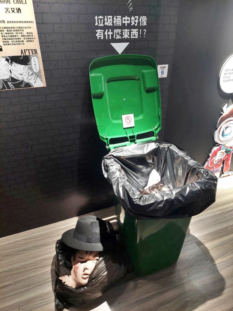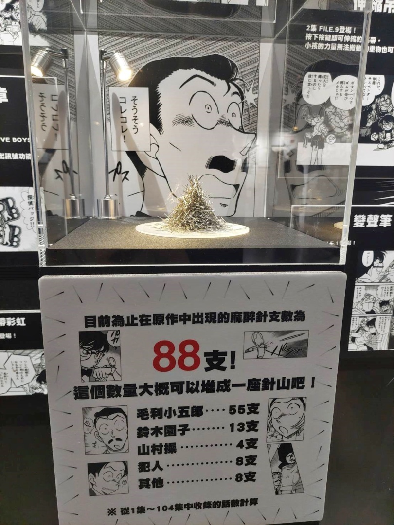 第四個展區「CONAN's HANNIN」是專屬於犯罪者們的展區,可以了解柯南制裁(?)犯人們的秘密道具,還能在此回顧犯人們最常使用的凶器(笑) 結論是生活中越容易取得的東西越會被拿來殺人呢!還有一整面的犯人牆,以及那些擁有悲傷隱情、讓人太過難忘的犯人們,不妨在這裡找找你印象最深刻的犯人吧。