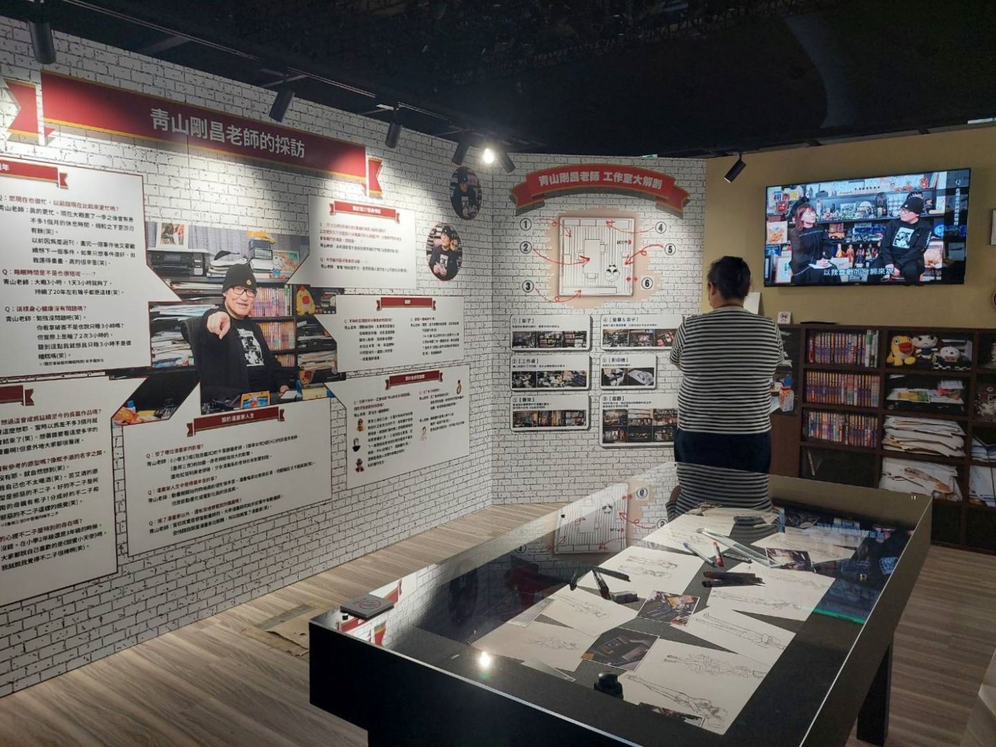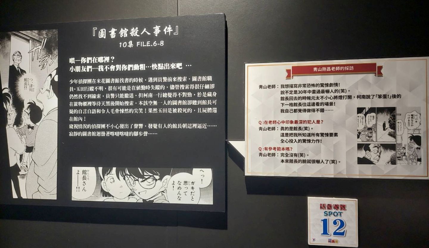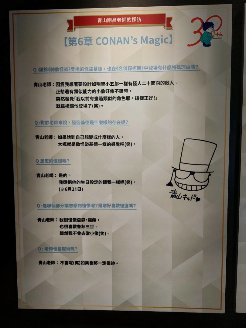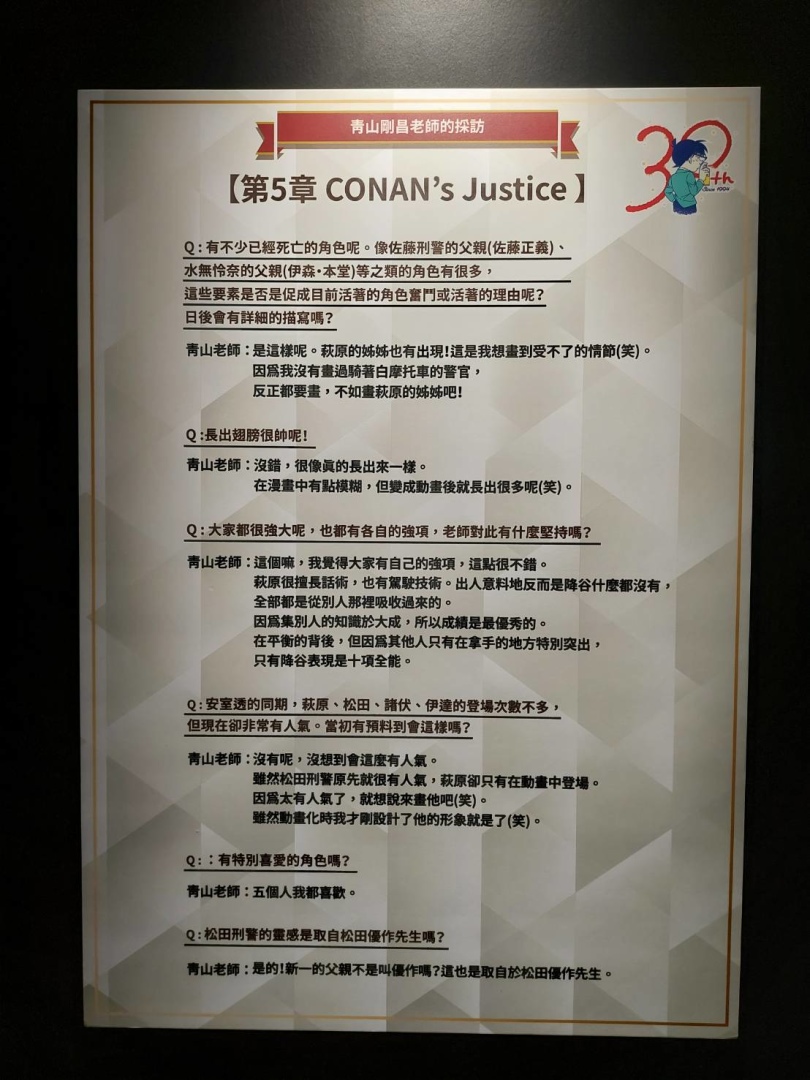 第七個展區「謝幕劇場」以投影呈現《名偵探柯南》30 年來的足跡、第八個展區「青山剛昌老師特別展示室」則以展版和老師的影像專訪呈現老師工作室的樣貌,談論他在《名偵探柯南》創作過程中難忘的部分,如前面所述,專訪的文字散布在各個展區的說明文字裡,但在這裡可以看到老師回答問題的風采!